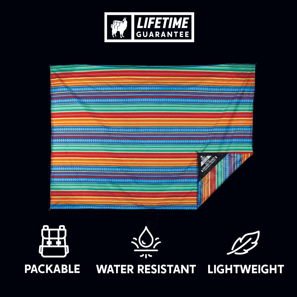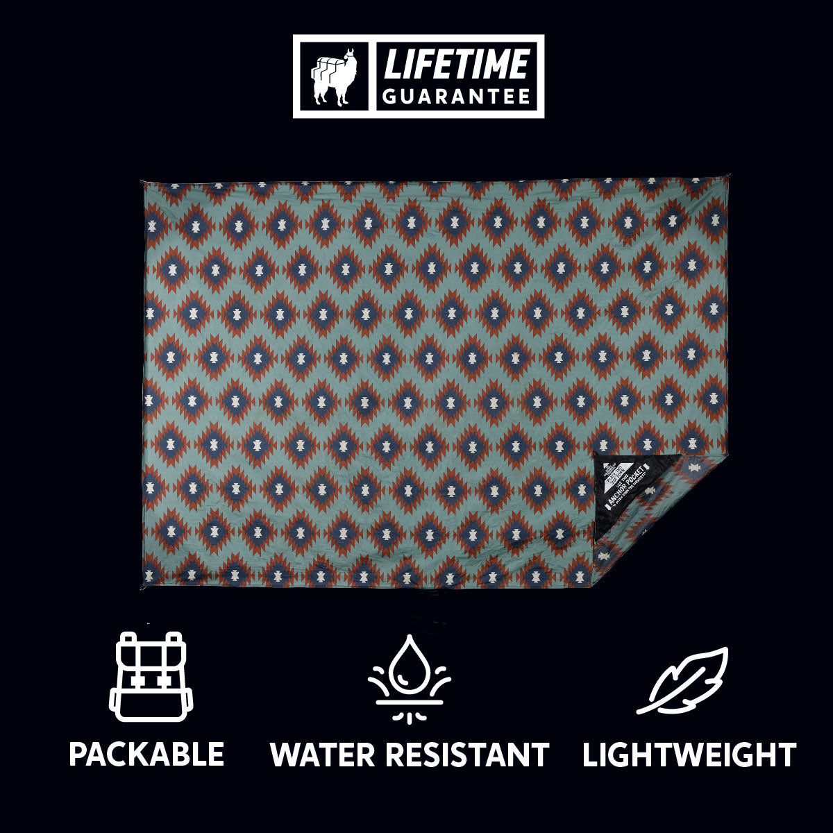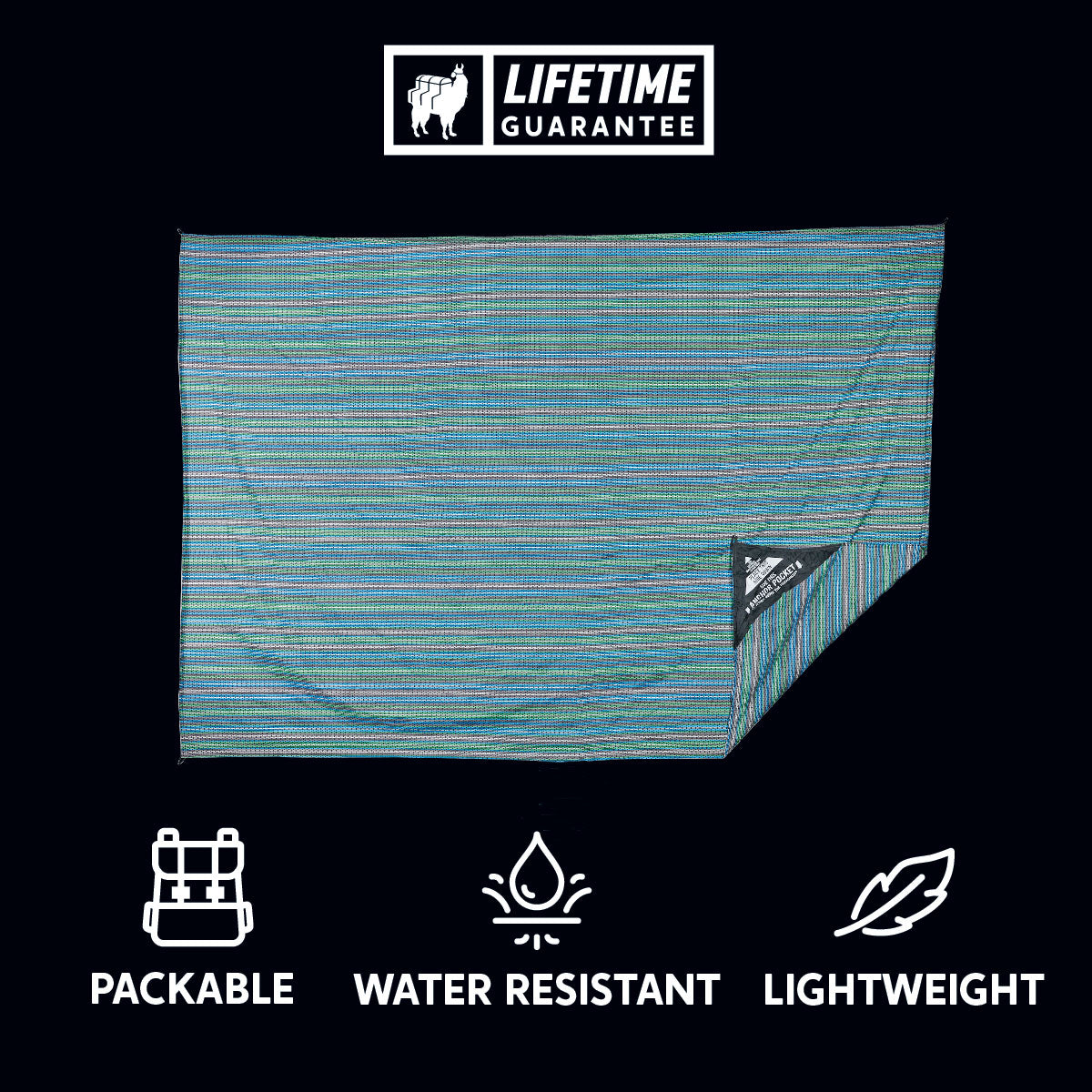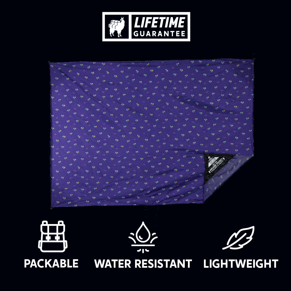 The perfectly designed, patented, waterproof adventure sheet. An essential item for lounging at a music festival, campground or beach. Featuring a PU coating to keep your rear and gear dry. The patented anchor pocket design helps fight winds, keeping your sheet in-place, while the added stake loops are great for use on firm ground. Made for transport to destinations near and far, this compact blanket quickly folds and unfolds for on-the-go convenience with an attached stuff sack for storage.