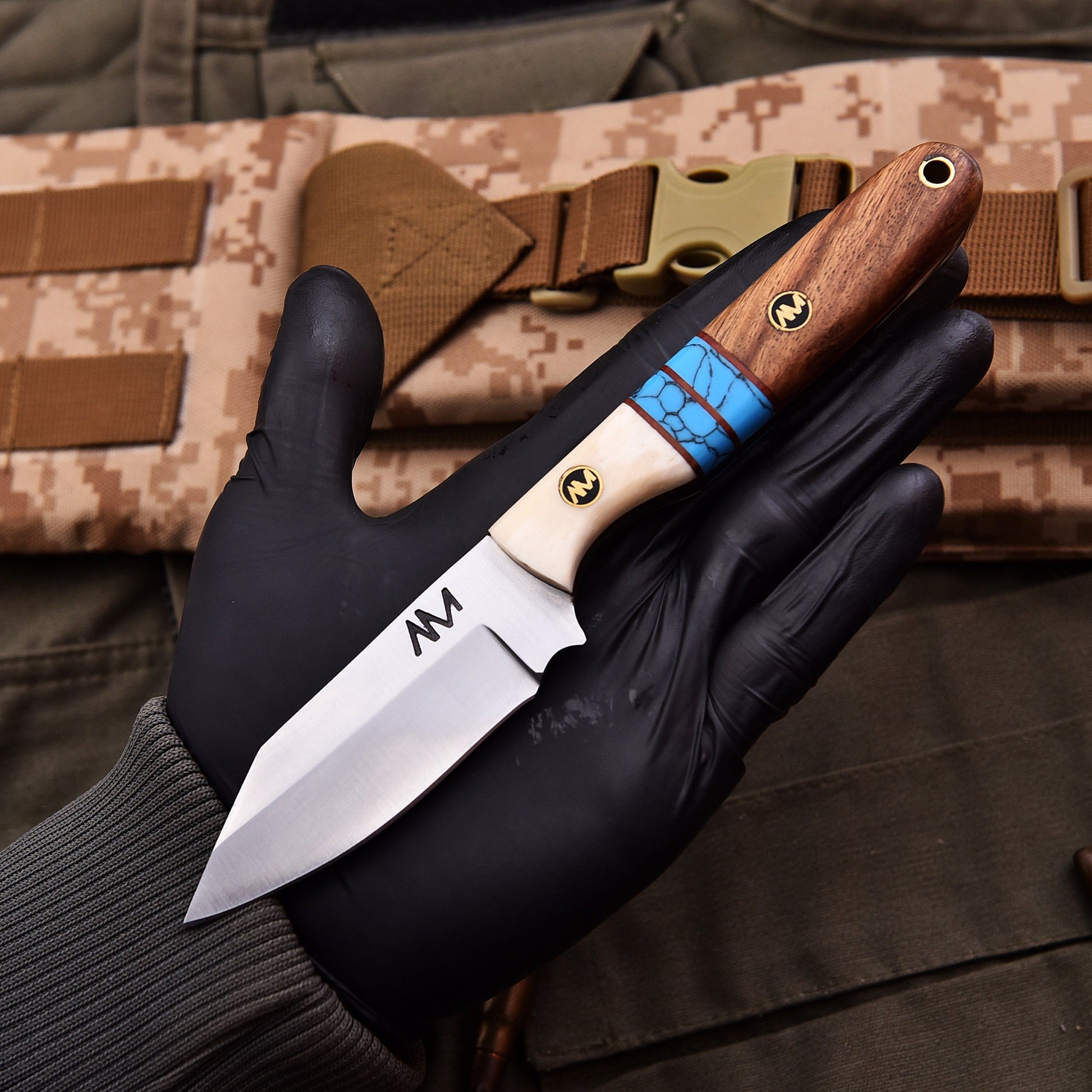 Bone, Turquoise & Rosewood Handle – A striking combination of natural materials for a unique, secure grip that blends traditional craftsmanship with outdoor functionality.