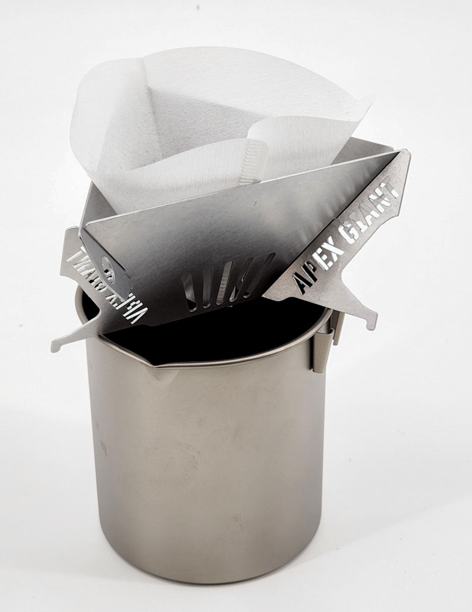 Our compact and portable coffee dripper is ultralight, functional and easy to clean. Comes in aluminum and titanium versions. Aluminum being lighter and titanium being stronger. Use just 2-3 tablespoons of ground coffee and add hot water. The perfect pour-over kit for backpacking, camping, the office and people on the go. Uses widely available #2 coffee filters (5 included).