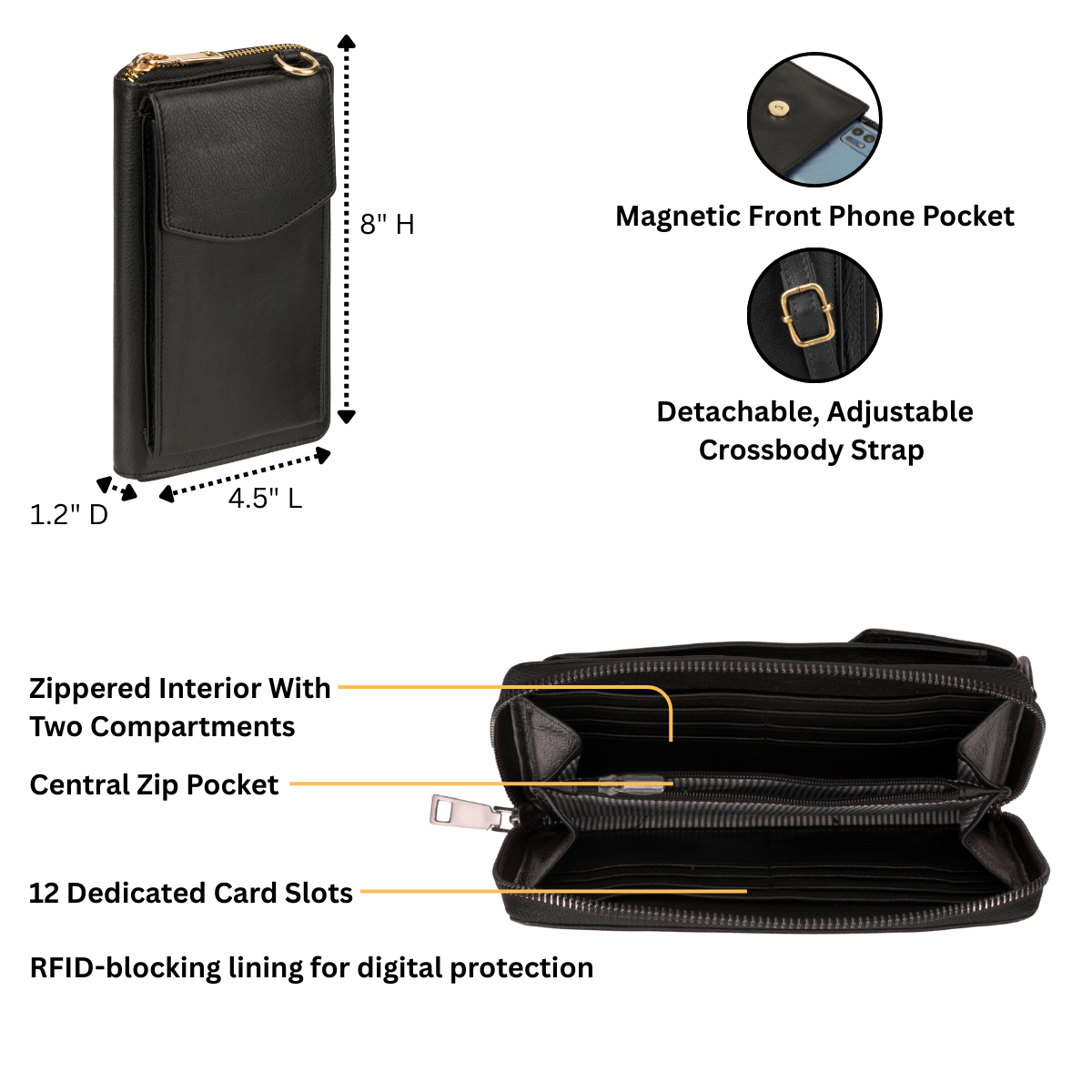 Closure: Full zip-around body with a magnetic front phone pocket