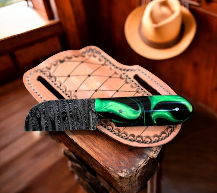 The Bull Cutter Knife - Castrating Knife is designed for precision, durability, and ease of use. This custom handmade tool boasts a 7.2-inch full tang design, ensuring balance and control. The 3.5-inch Damascus steel blade delivers exceptional sharpness and strength, making it an ideal choice for ranch work or other precision tasks. The ergonomic epoxy resin handle offers a comfortable and secure grip, even during prolonged use. Paired with a stylish and functional Western-style sheath, this knife is not only practical but also a striking addition to your collection.