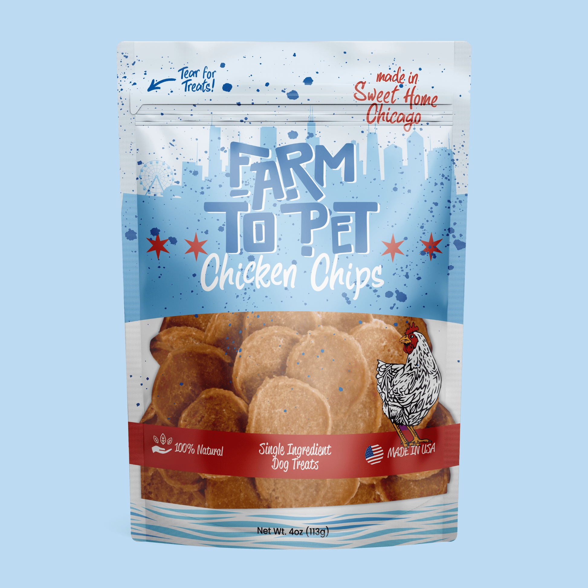 Farm to Pet is proud that 100% of our single-ingredient Chicken Chips for dogs are made in Chicago IL, USA and responsibly sourced from midwestern farms. So much so that we put the Windy City skyline and colors on a signature bag! Every time you treat your pet to our crunchy combo of irresistible flavor and healthy nutrition, you will know you are both getting Chicago's best. Because all pets deserve only the best treats!