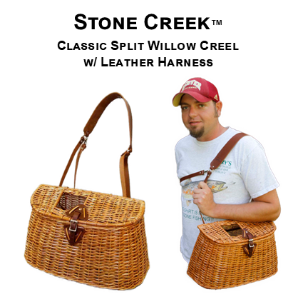 *Made in the U.S.A., our creels are made of fine quality split willow and lacquered for long lasting protection. The leather latch strap and harness, both made in U.S.A., have rust proof buckles and snaps.