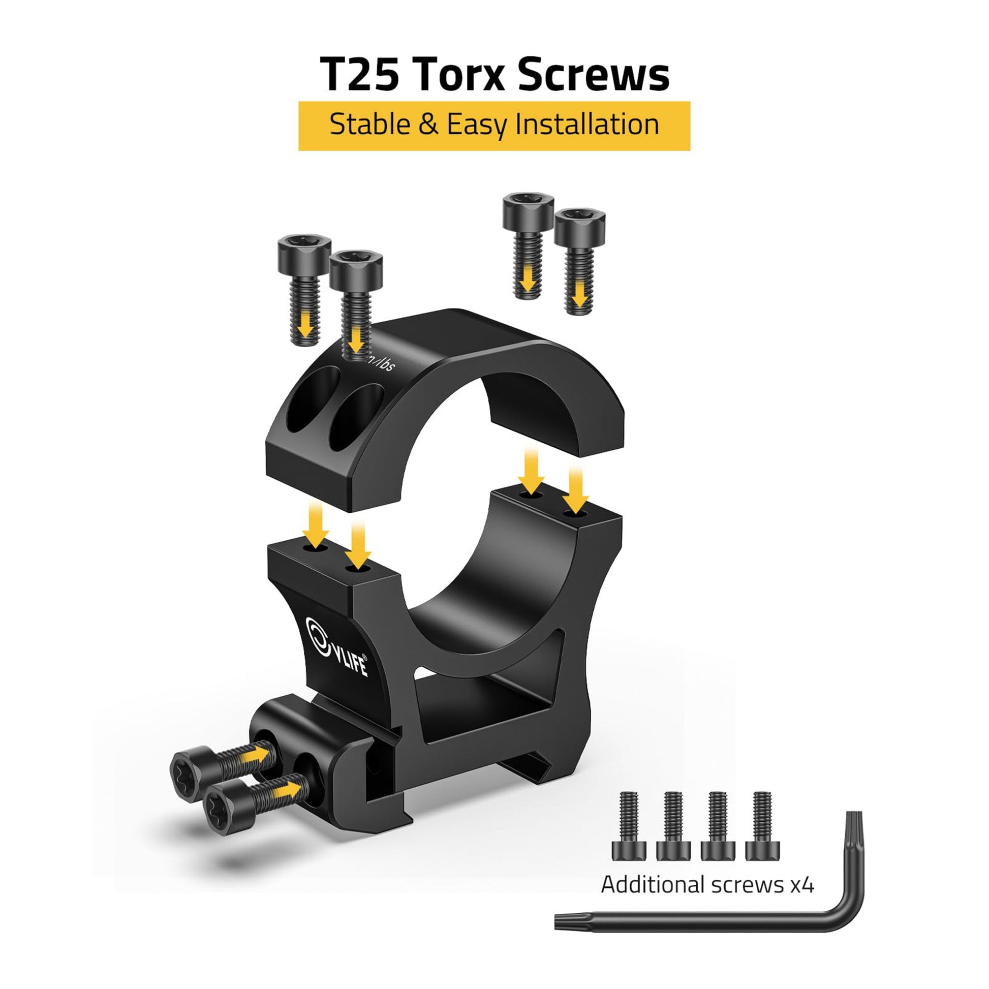 Lightweight and Sturdy Scope Mounting Kit: The package includes two riflescope rings, a T25 wrench, and four additional screws. Sporting optics mounts ring compatible accessories: Airsoft, 10/22, rimfire, .22 pellets, .22lr, .177, .17 hmr, 5.56, 223, .308