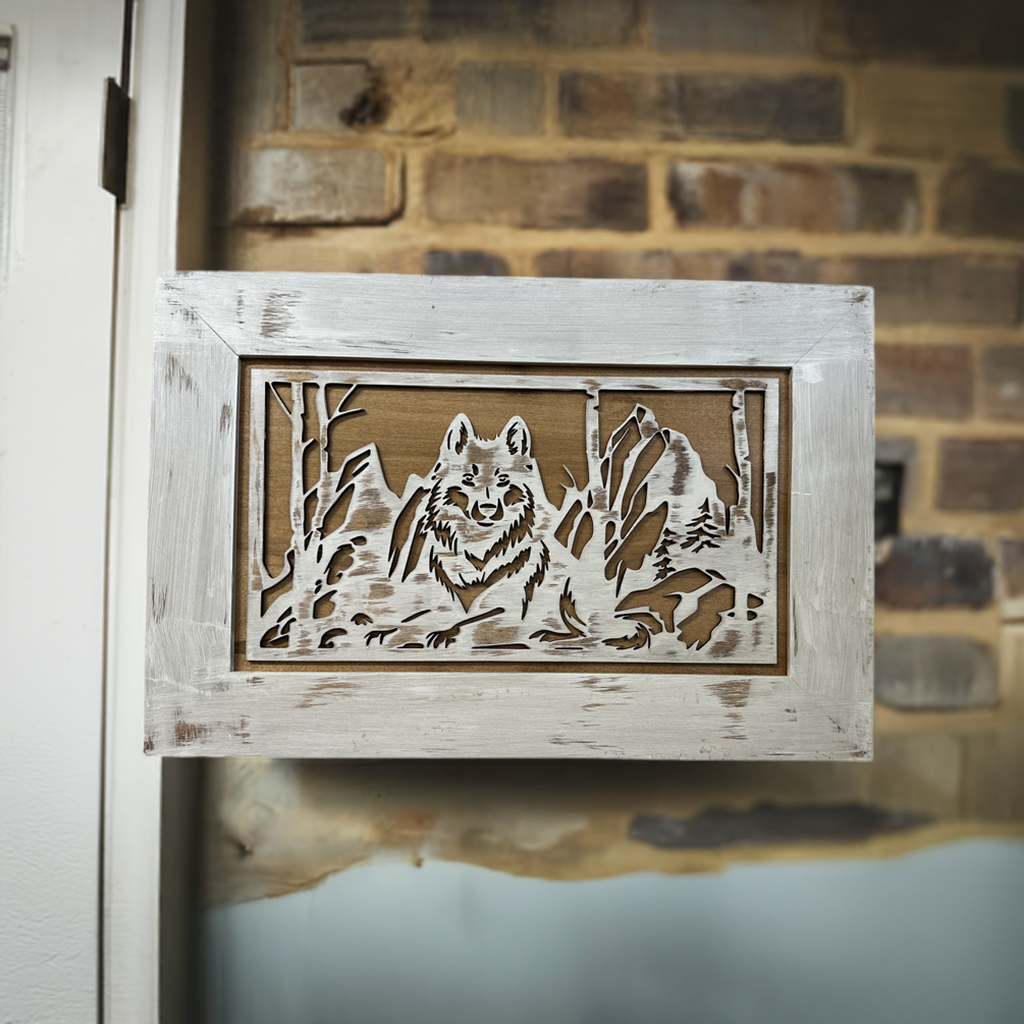 Securely store your firearm in the Decorative White Wolf Wall-Mounted & Lockable Gun Cabinet. Your firearm and other tactical gear are easily accessible yet securely stored, ensuring you never have to worry about unauthorized access. Once you apply the key, the lock immediately disengages and you’re ready for home defense. This cabinet features a distressed white wooden frame, a deep black interior, and an eye-catching 3D white wolf and mountain scene. The cabinet will be a stunning focal point in any room, and no one will ever know what’s inside!