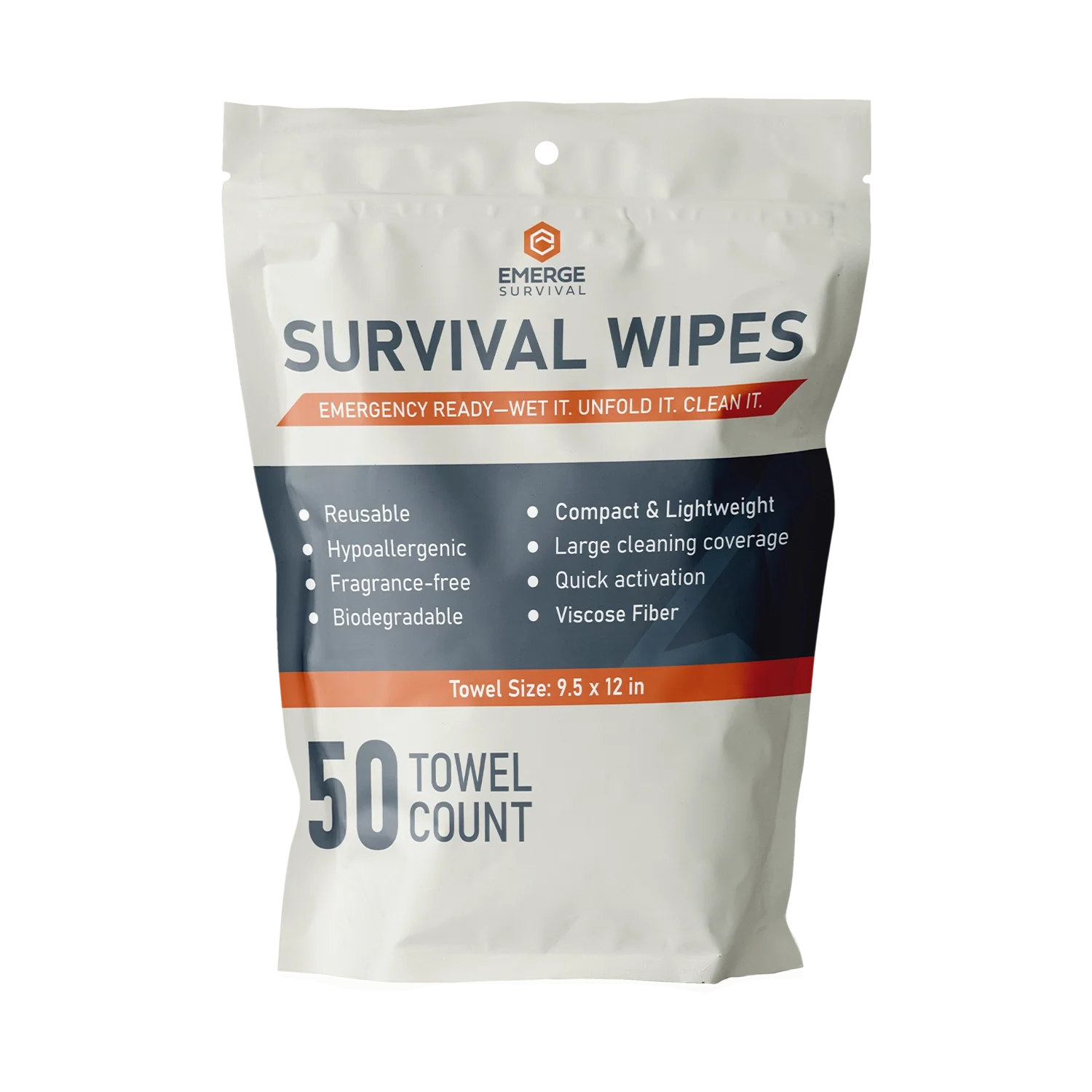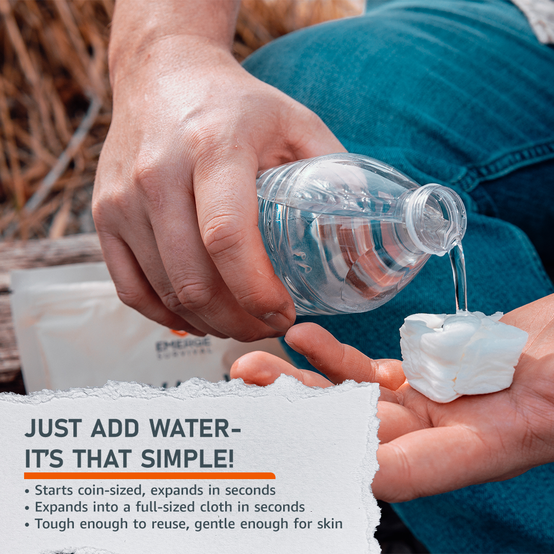A compact, durable hygiene essential for survival situations, Emerge Survival Wipes expand into a full-sized, reusable cloth with just a splash of water. Perfect for cleaning hands, body, and gear when soap and water are scarce.