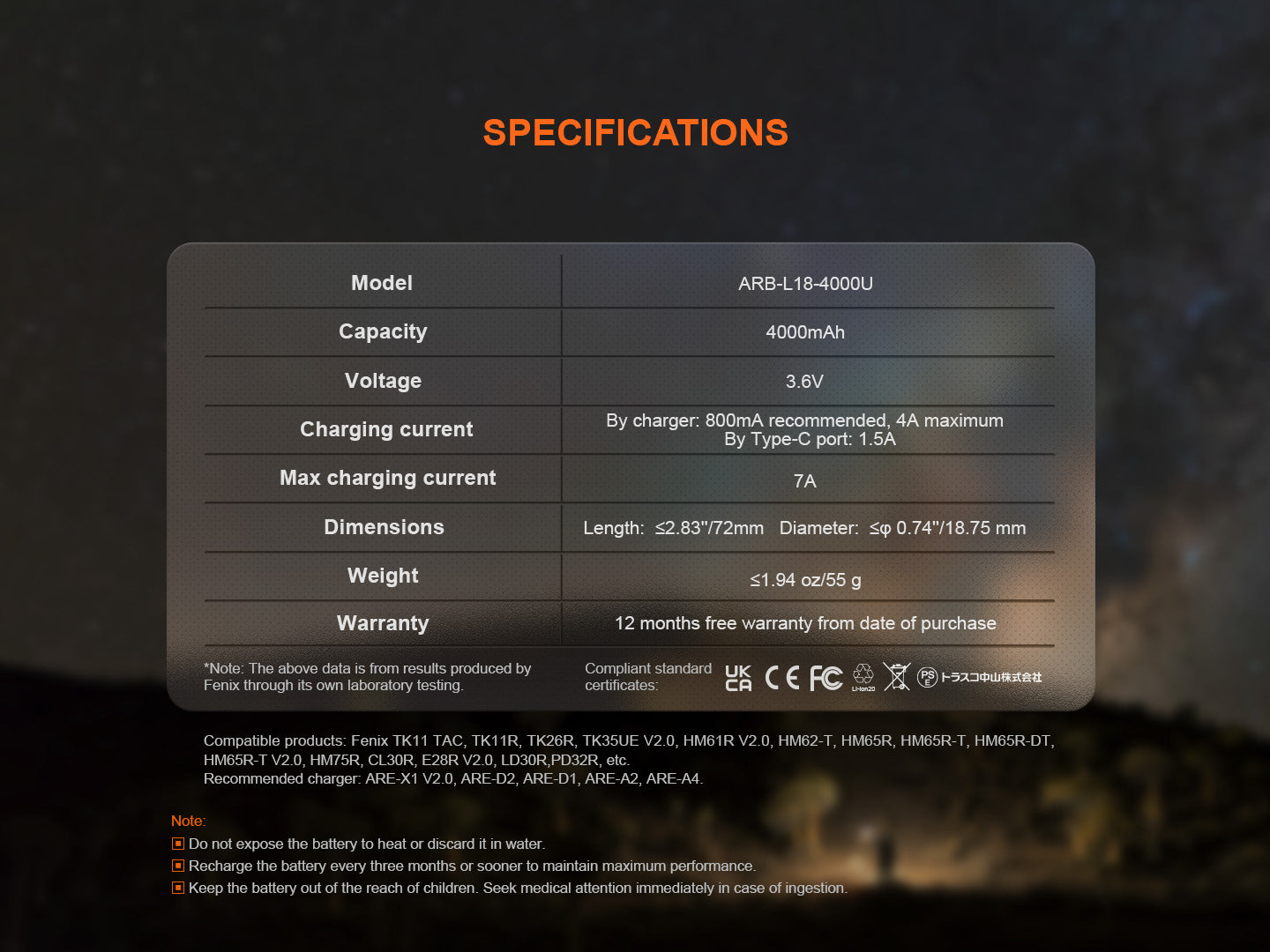 The Fenix ARB-L18-4000U High-Capacity 18650 Battery boasts a built-in USB-C charging port and a top-of-the-line 4000mAh rating, ensuring, convenience, top-notch performance, and dependability. With built-in safeguards such as short-circuit prevention and multiple protective layers, along with a button-top design perfect for various Fenix LED flashlights, this rechargeable battery series is the ideal option for superior lighting capabilities. The Built-in USB-C charging ports means that you don't need anything more than a charging cable to get going, not external battery charger needed.