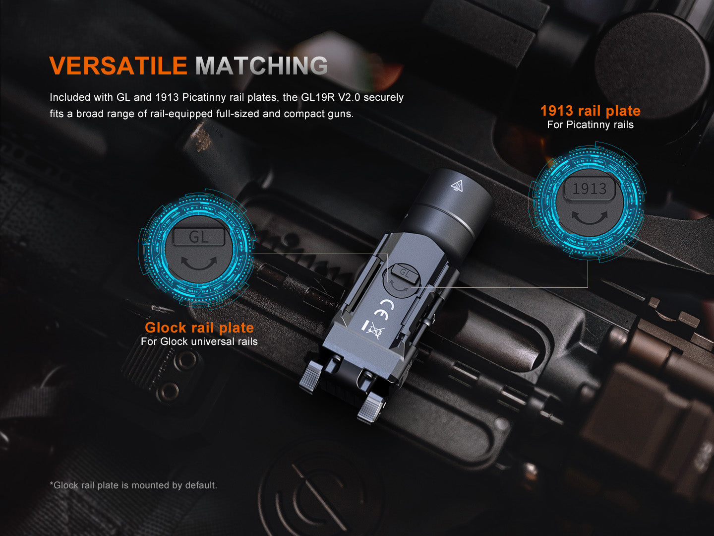 The GL19R offers quick assembly and disassembly with versatile rail plates that are compatible with Glock universal rails and 1913 Picatinny rails, providing excellent adaptability across various platforms. Additionally, this flashlight includes a hidden battery level indicator to keep you informed of your power status and is equipped with USB-C charging for fast, efficient recharging. Its digitally regulated output ensures consistent brightness throughout the battery’s life, while the IP66-rated water resistance means it can withstand harsh environmental conditions. Durable, high-performing, and intuitively designed, the Fenix GL19R is an exceptional choice for anyone looking for a powerful tactical flashlight with unmatched versatility.