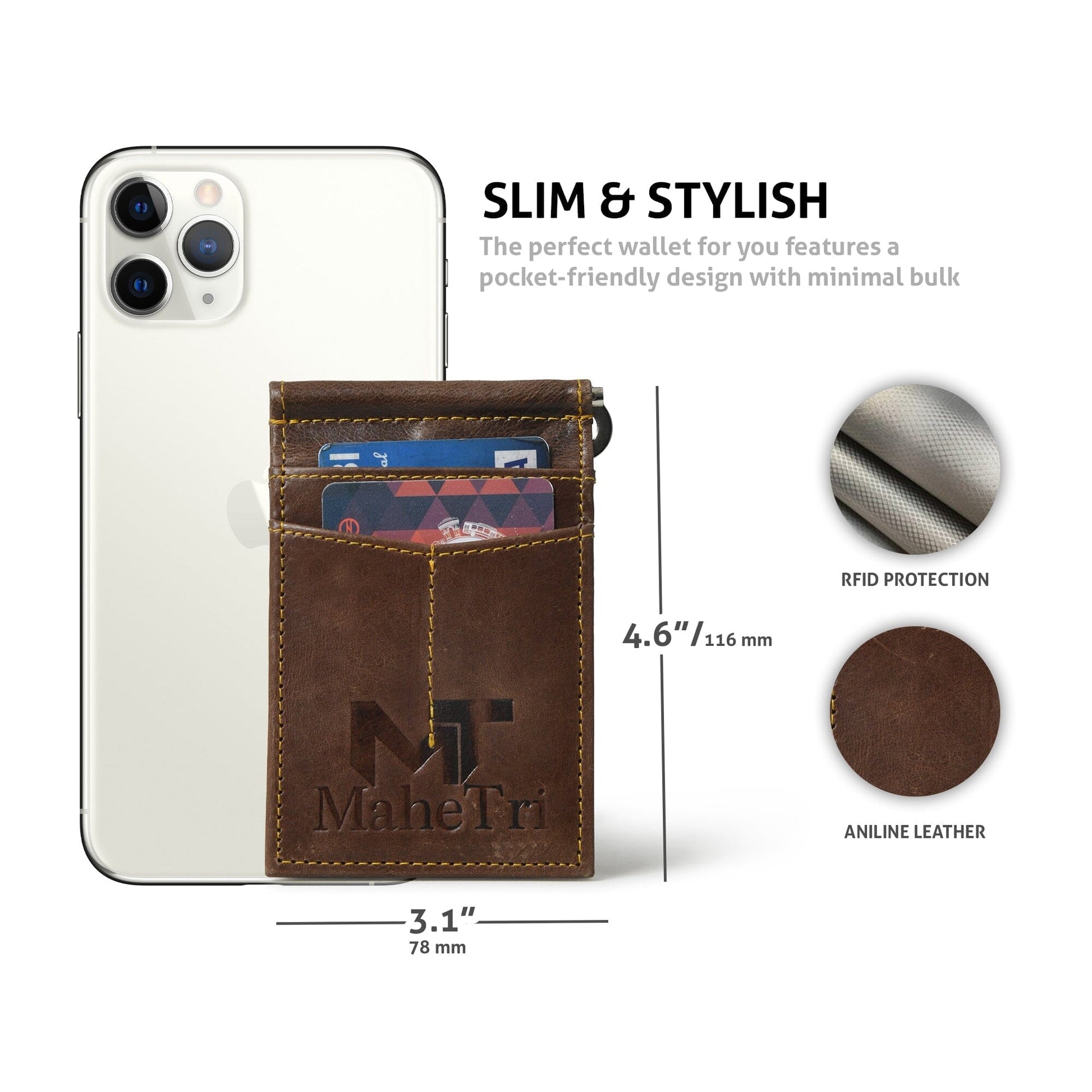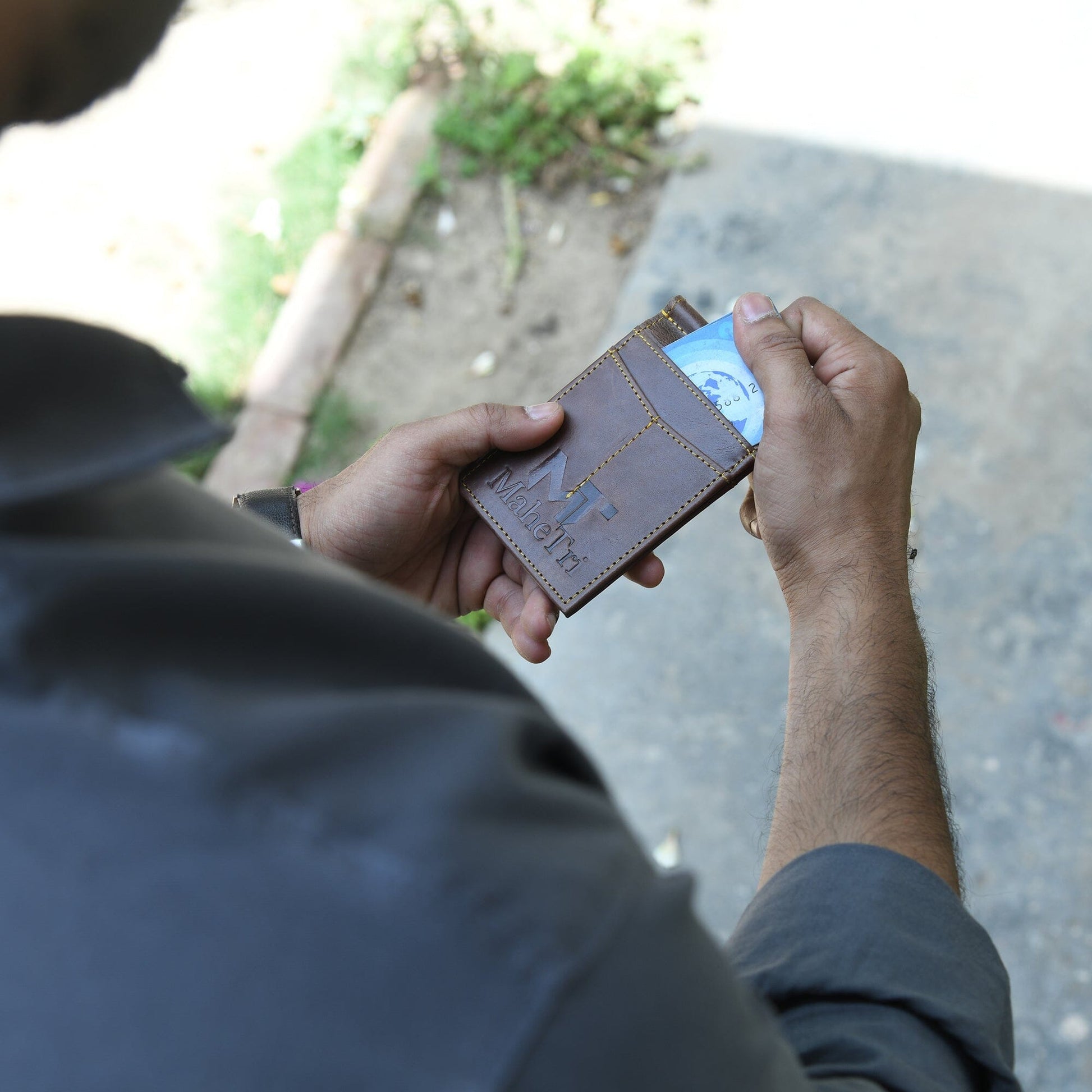 A beautifully crafted very slim profile money clipper wallet for men. It is handcrafted from buffalo leather by highly skilled artisans. This money clipper wallet features a few card slots, an Id slot, and an interior money clip that keeps the cash organized and safe.