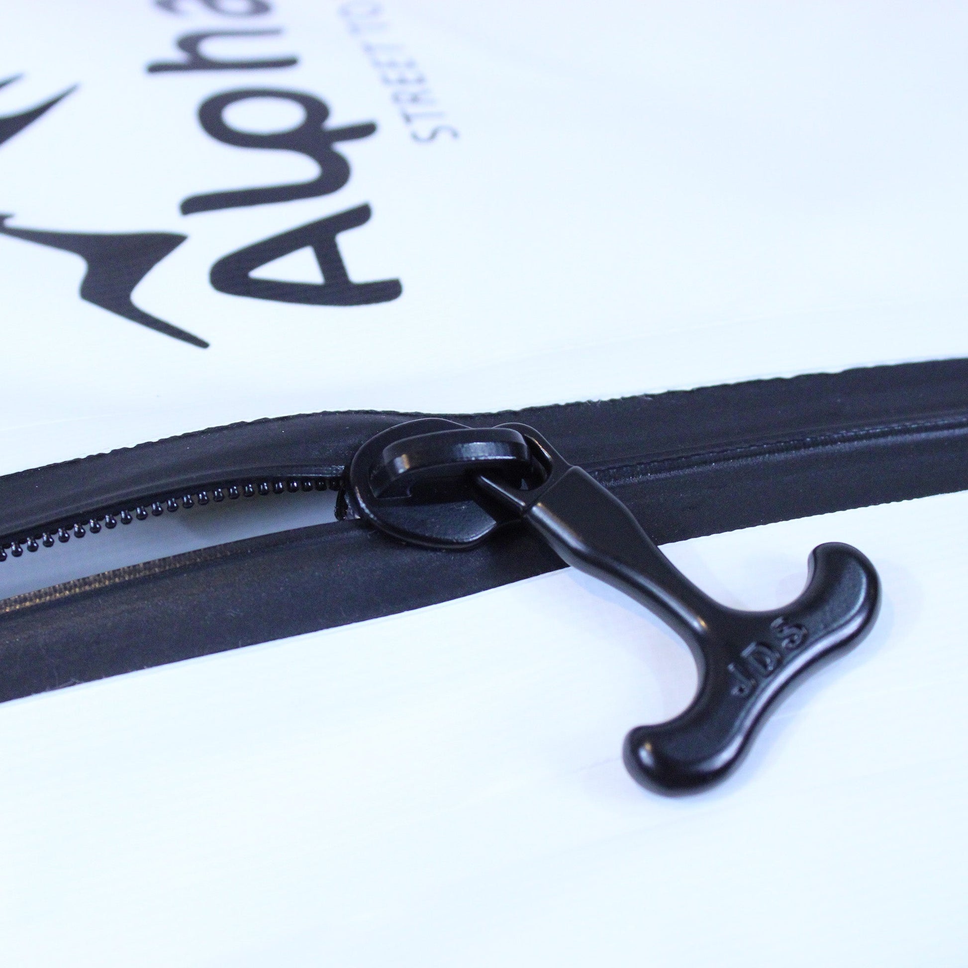 - Top opens and closes with zipper, then folds down and buckles twice to secure