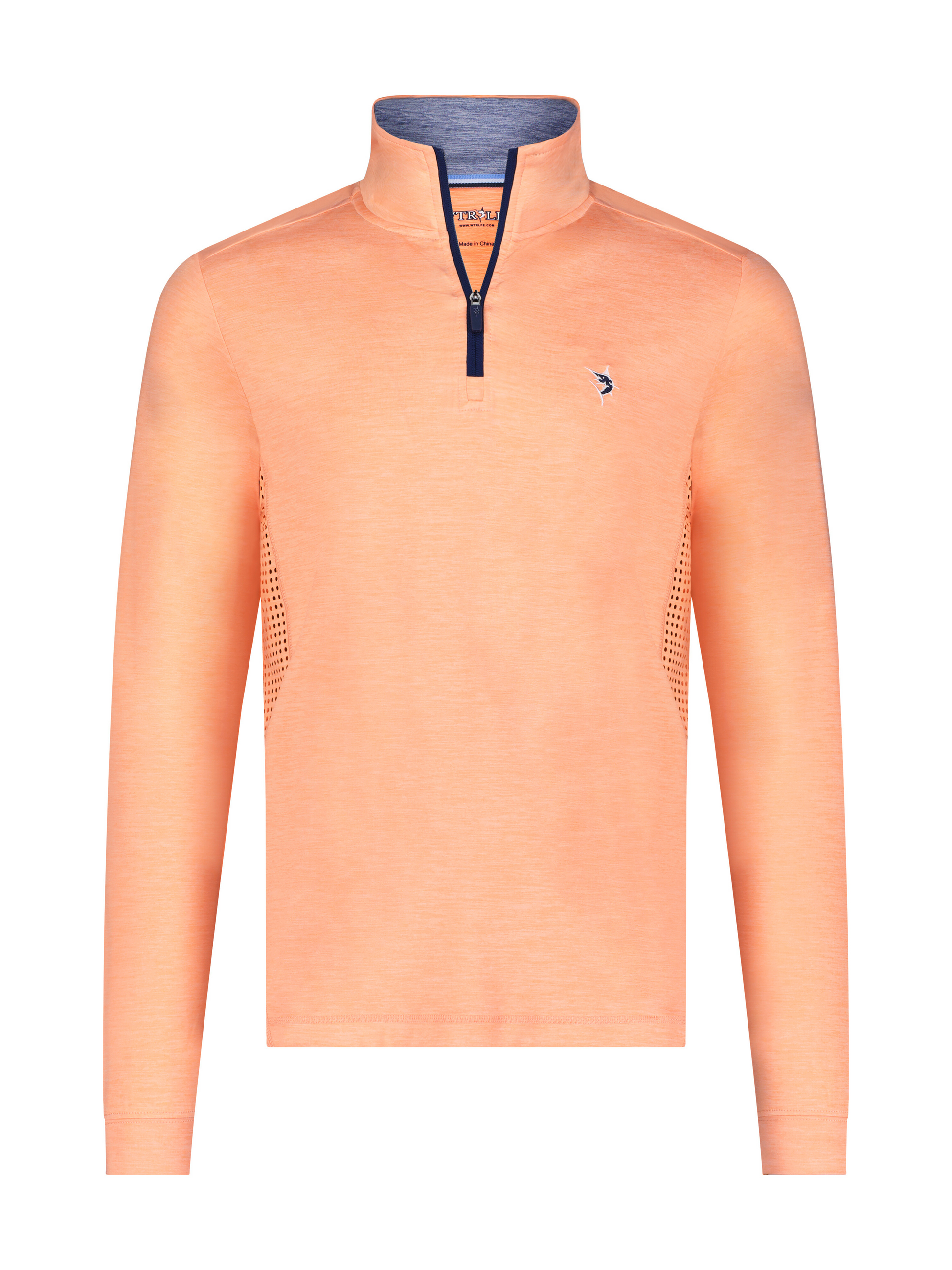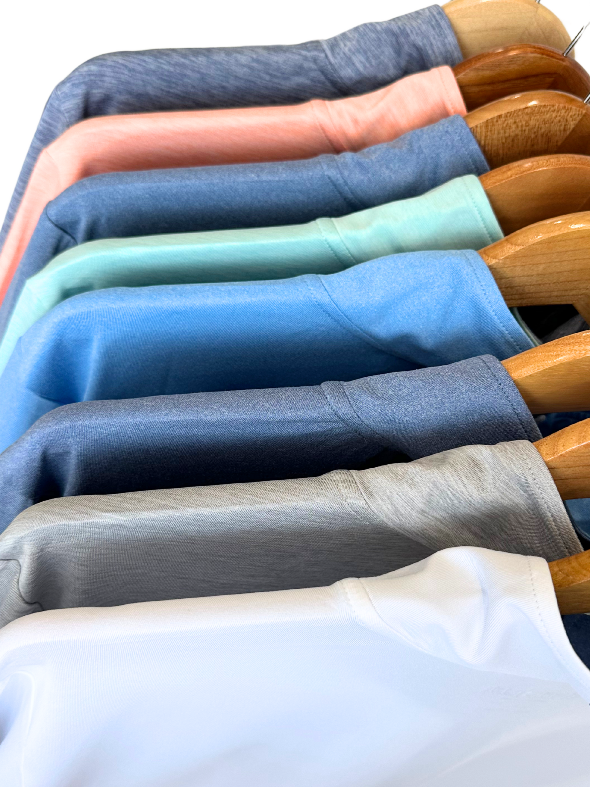 Lightweight Space Dye performance quarter zip featuring soft poly spandex wicking fabric. Sun Protection, UV50 with laser insert venting to keep you cool when needed and patented silicone sleeve grip which holds your sleeves in place and keeps them clean. Perfect for every day.