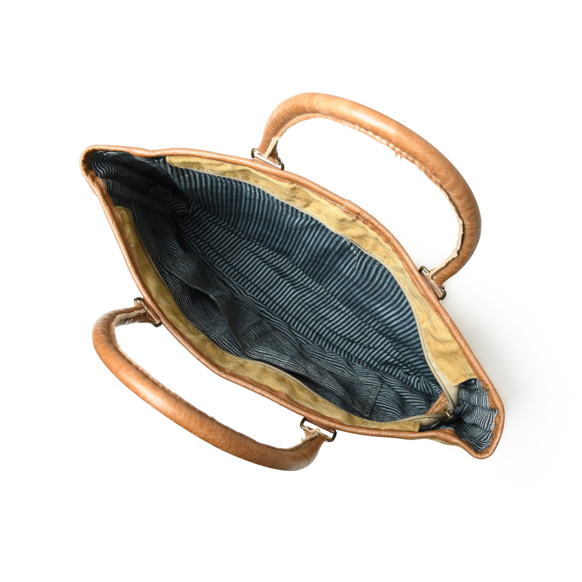 Contrasting Appeal: Fashionable brown leather handles provide a striking contrast, adding sophistication and a touch of rustic charm to the bag's overall aesthetic.