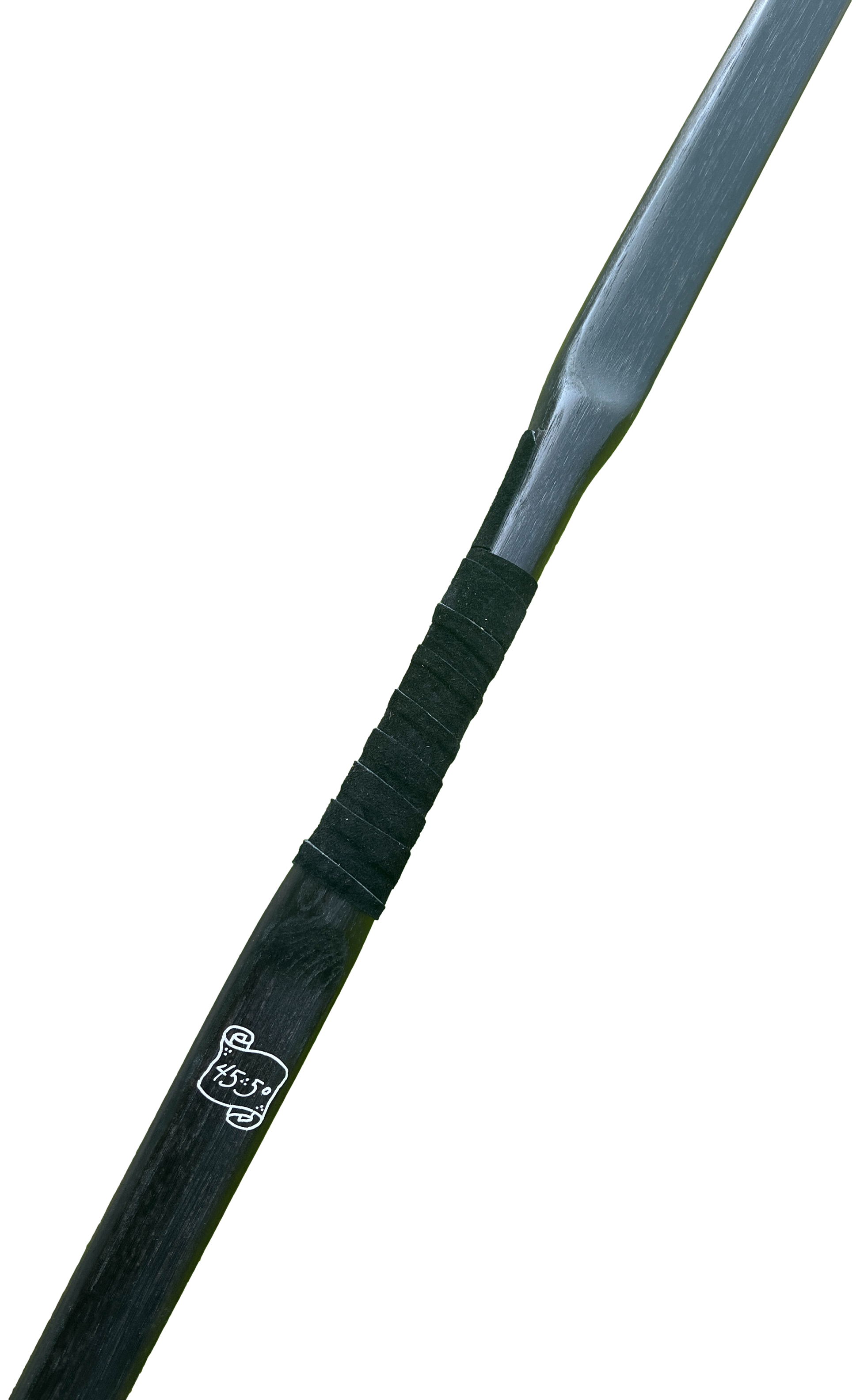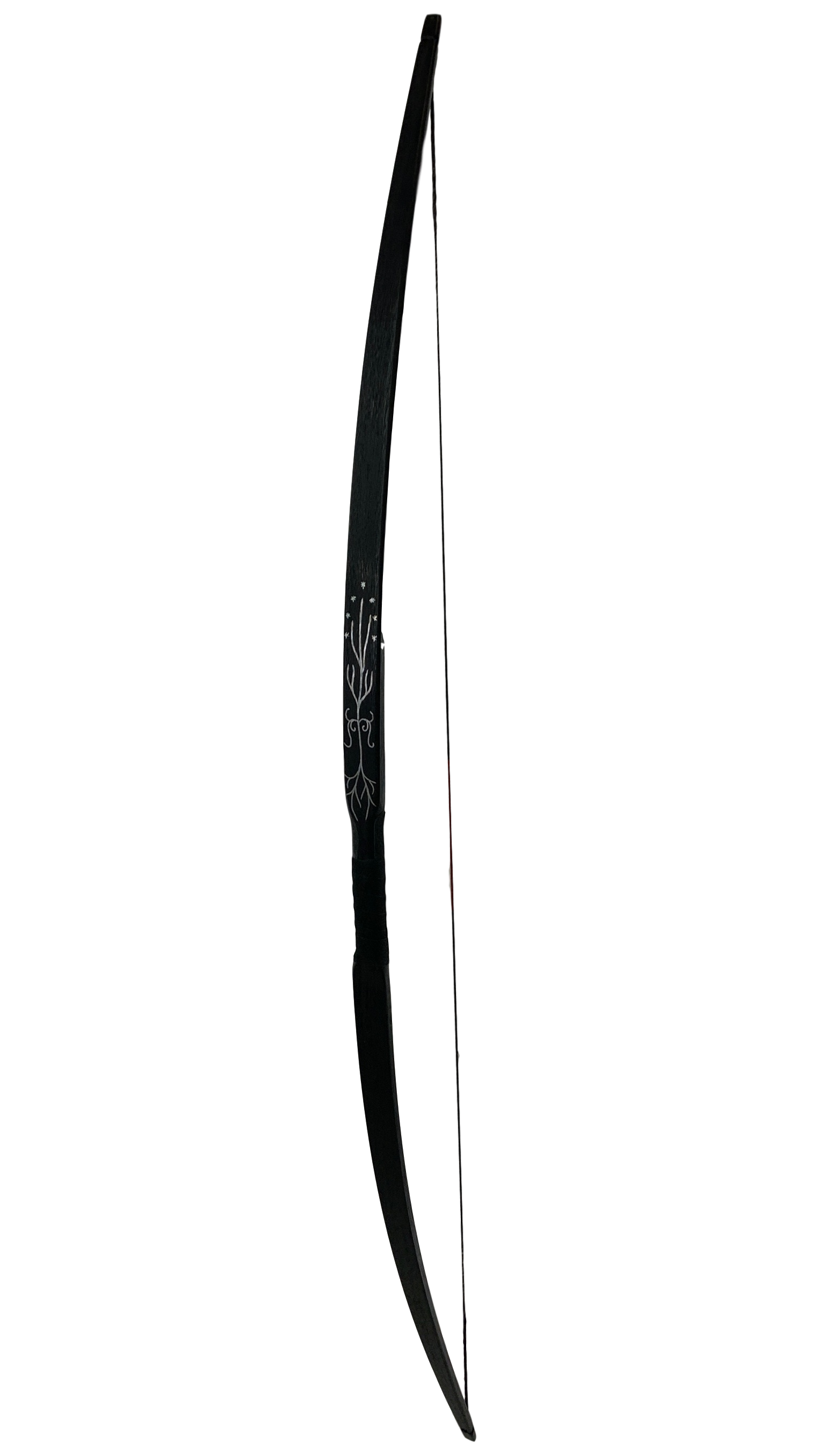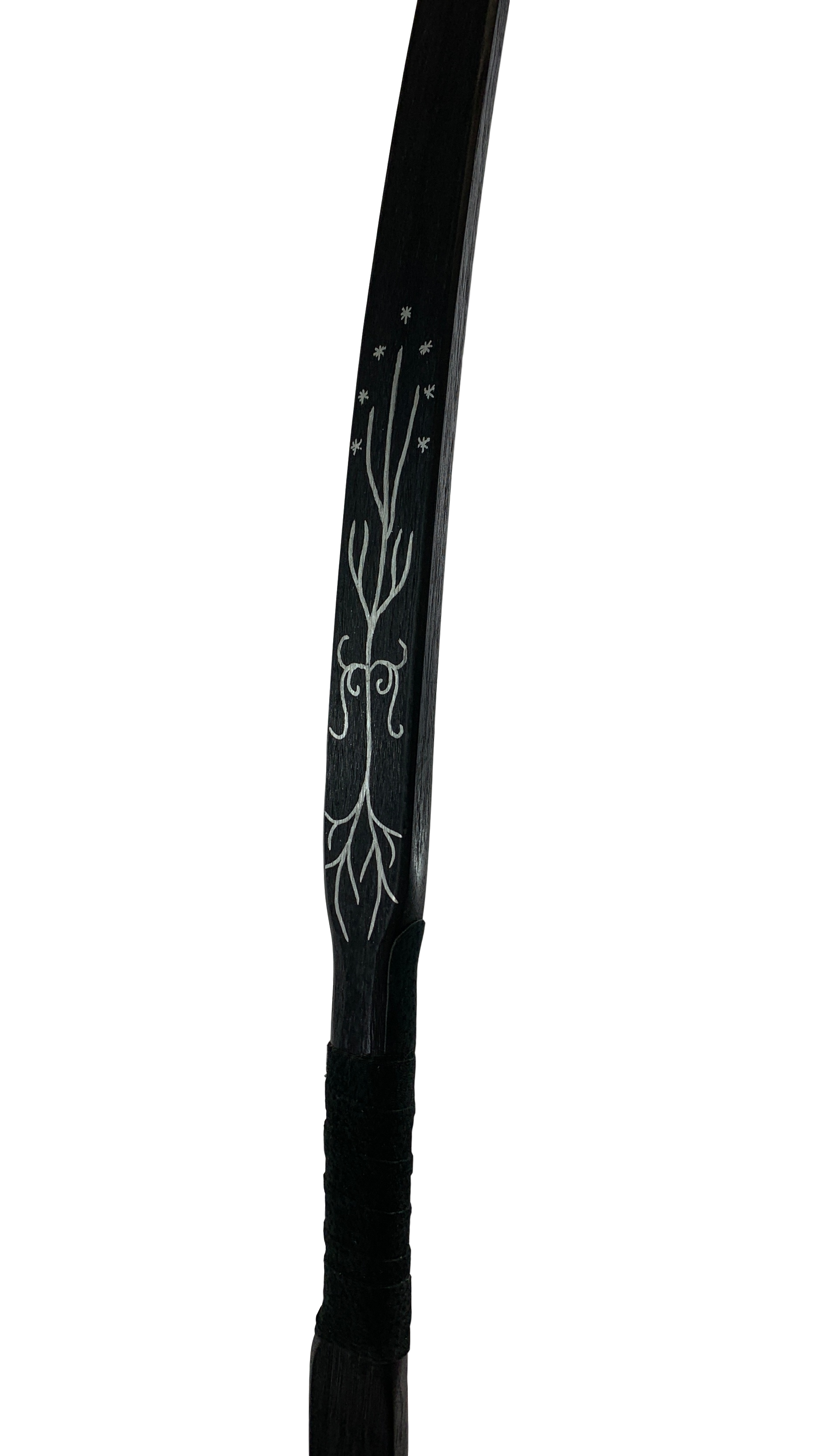 Inspired by the rangers of the J.R.R. Tolkien and the Lord of the Rings movies, the Ranger of the North Bow was designed to capture the power and durable bows carried by the rangers. This is a very versatile bow, can be easily slung over your back to allow you to navigate through the woods and hills. Then simply pull back and take aim at your target. The Ranger of the North Bow is a uniquely handcrafted 65" hickory bow with beautiful silver artwork painted on a black bow to capture the essence of the rangers and the power of a fully functional longbow. Each bow has a black leather handle wrap and black stain. If you wish, your name can be painted below the banner as well.