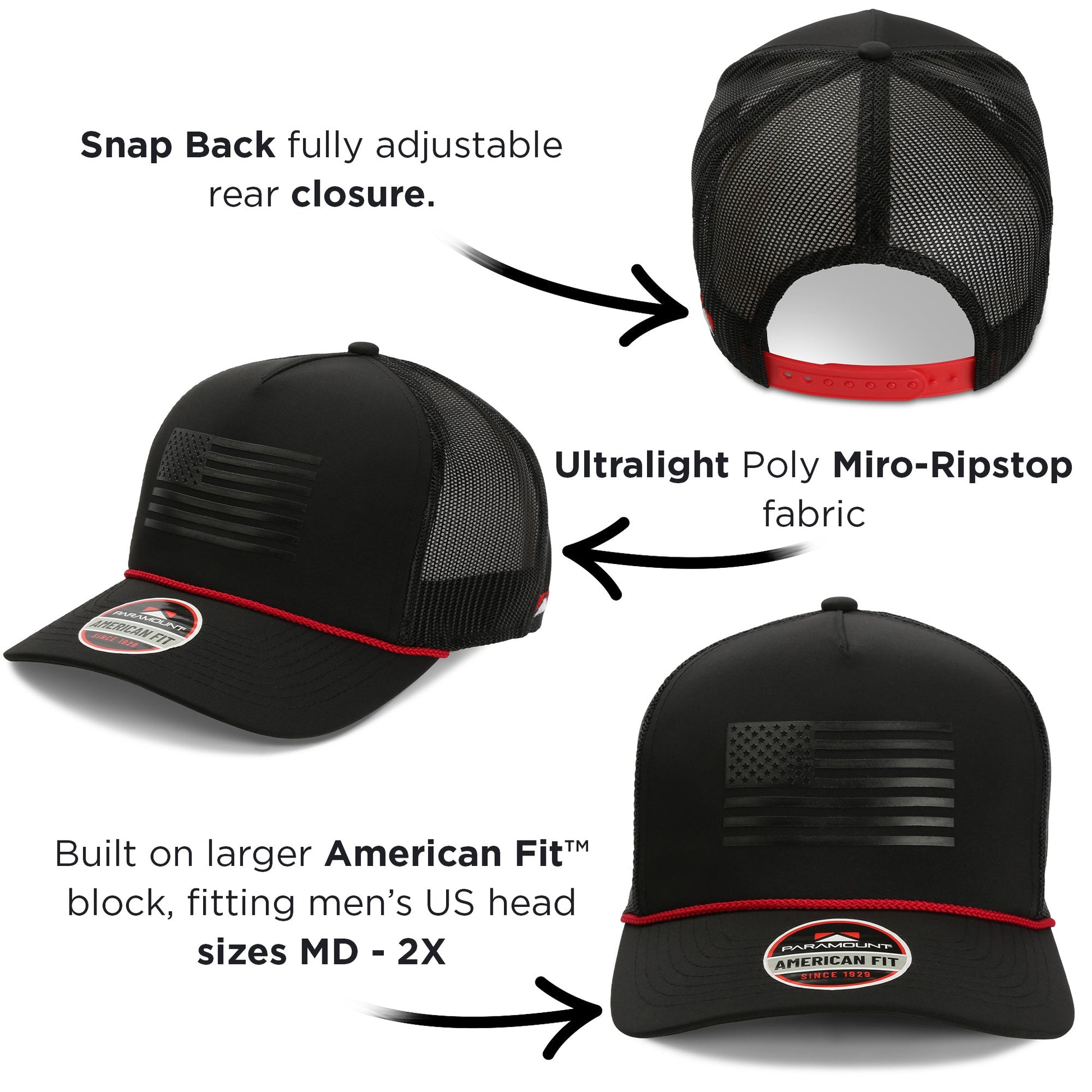The Ridgeline is a 5-Panel structured trucker style American Flag Thin Red Line Rope Cap. Coupled with our American Fit™ design, fitting US heads sizes MD - 2X. Traditional caps only fit sizes SM - XL. American Fit™ sizing is a throw back to the original American size standard established in 1929. Additionally, this black American Flag Cap features a red rope and mesh back. Lastly, the Snap Back closure offers a comfortable and adjustable fit. Patriot Series