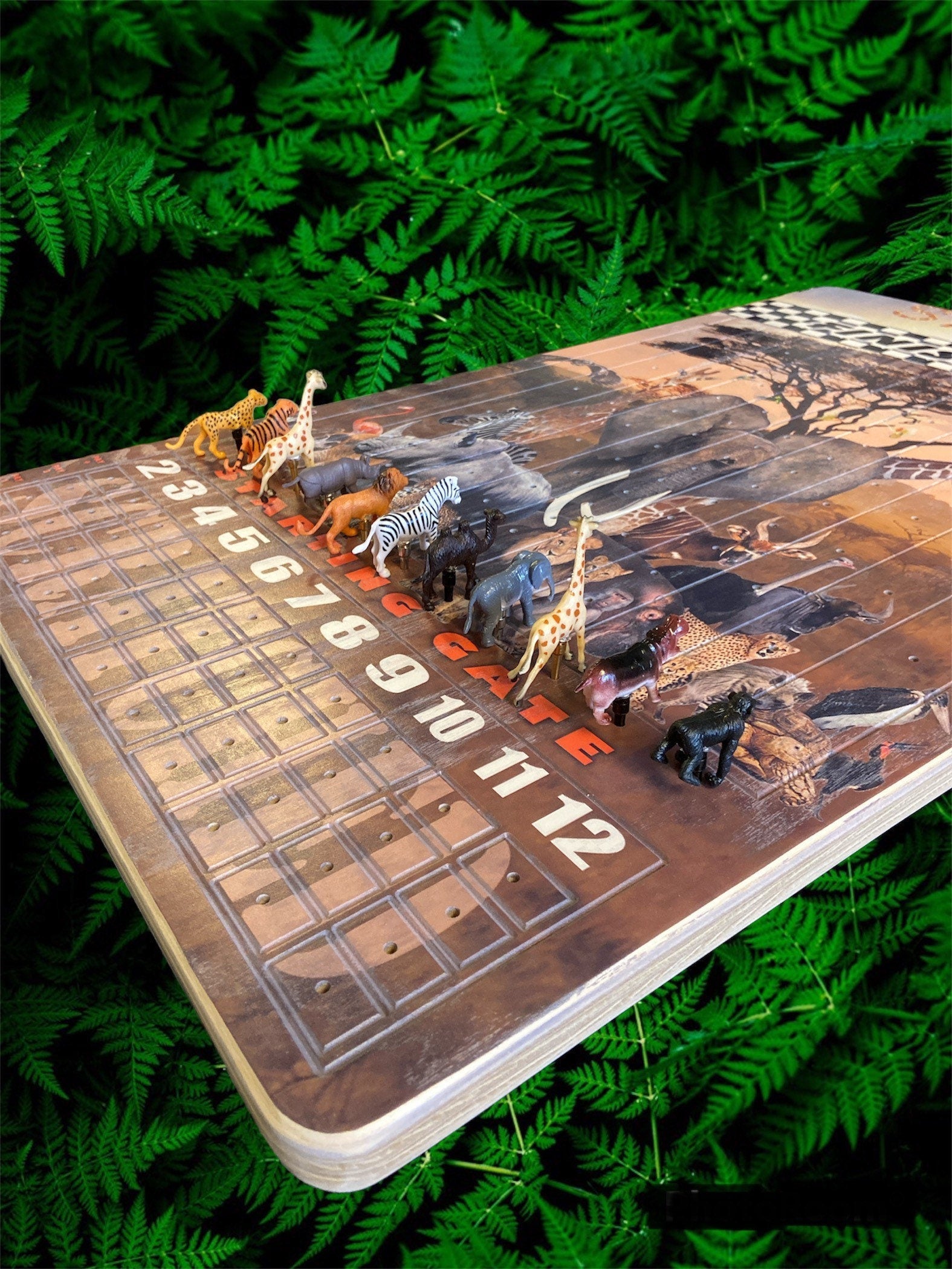 Beautiful custom printed (no decal!) on 1” thick Furniture Grade hardwood horse racing game involving dice, cards, gambling, and optional drinking spaces. The night will never end! This game is addicting, so proceed with caution! Have loads of fun with a group of friends and make sure you are in a place where you can get noisy! We make these boards out of high grade 1” furniture grade birch hardwood, CNC cut and engraved, before they are printed on a UV direct printer (right onto the wood surface (no decals or stickers). The design options are unlimited so let your imagination run wild as we can make it a reality with our high-tech equipment and machinery.