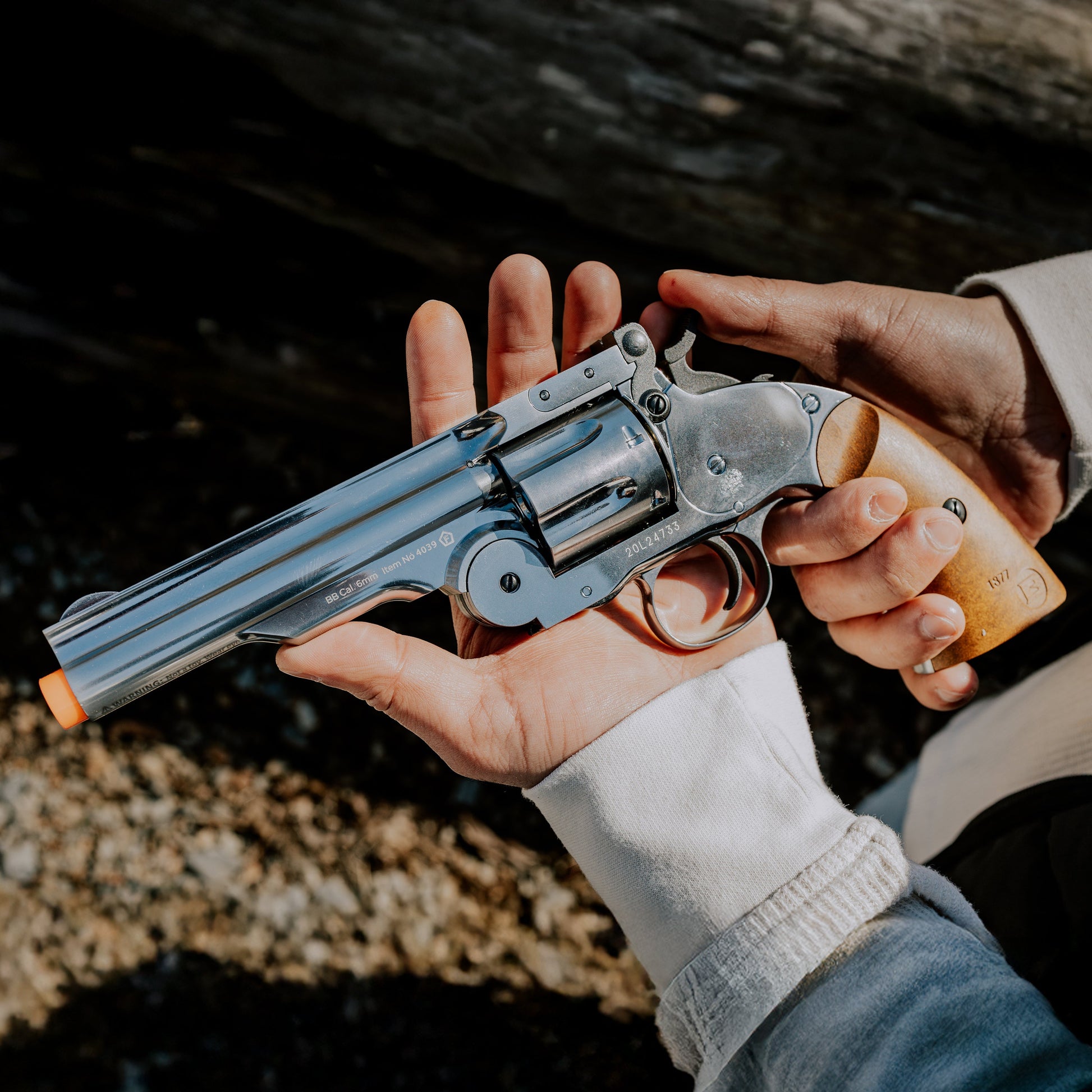 The Schofield is probably what you envision when you think of a Wild West shootout. Shooting with this beautiful piece of frontier history is your chance to unleash your inner outlaw or sheriff depending on your team preference (no judgement either way). Perfect on the range, for firearm proficiency and training, or backyard plinking, the Schofield No.3 Vintage Revolver from Barra Airguns is the right pistol at the right price.