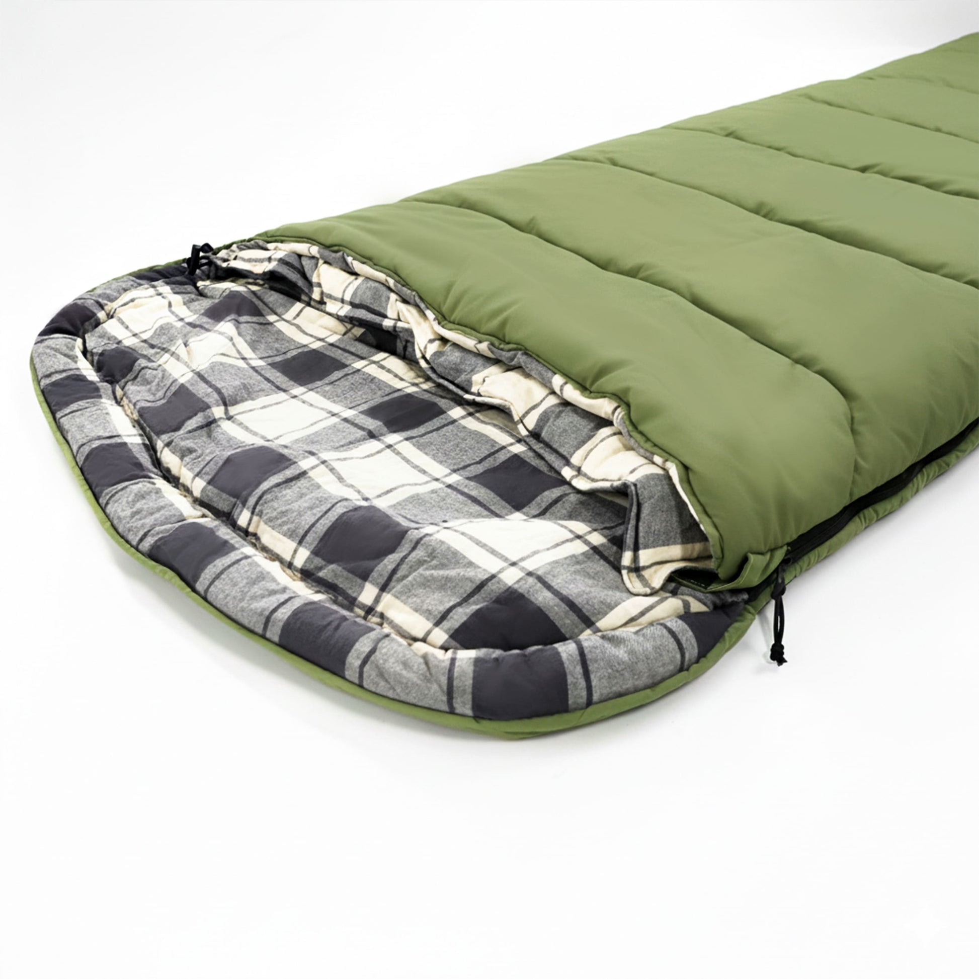 Designed for real outdoor use, this sleeping bag pairs a durable, rip-resistant outer shell with a buttery-soft flannel lining you can feel the moment you climb in. High-performance insulation, reinforced stitching, and premium zippers ensure dependable warmth whether you’re camped in the mountains, the woods, or the back of your truck.
