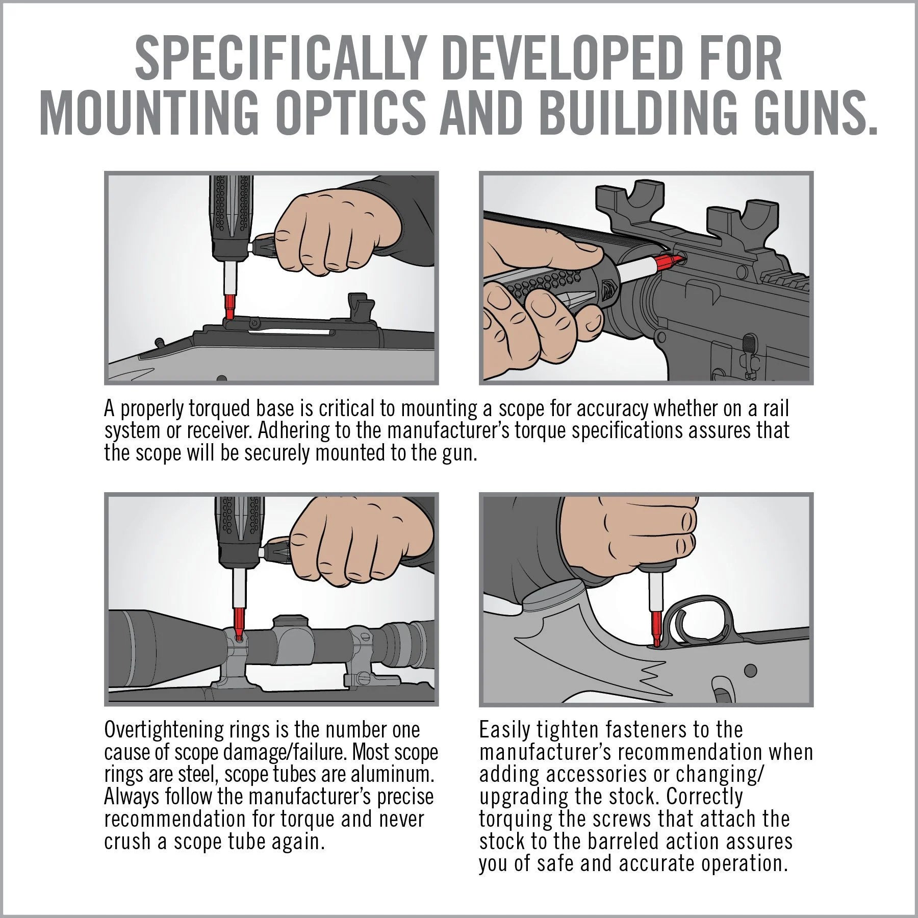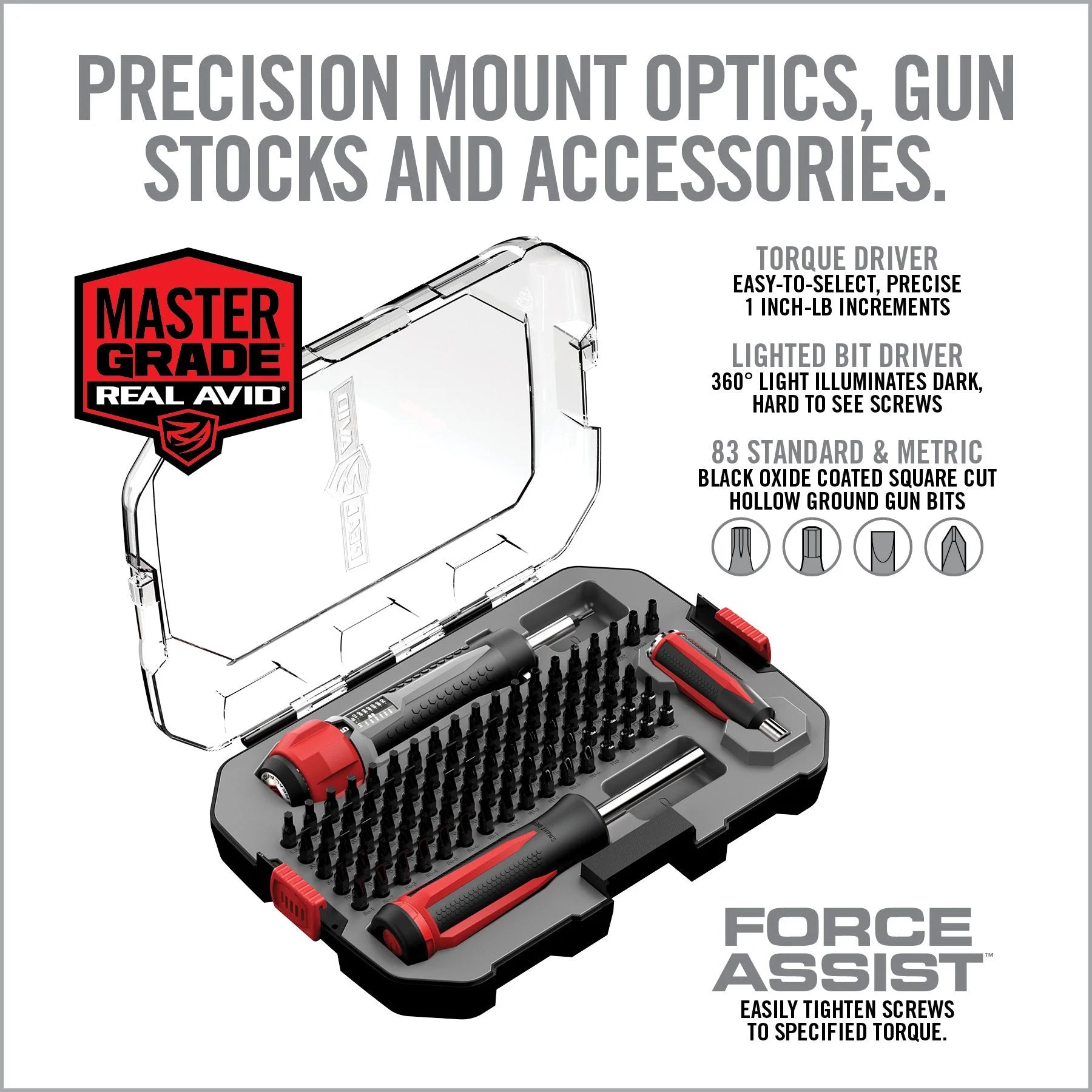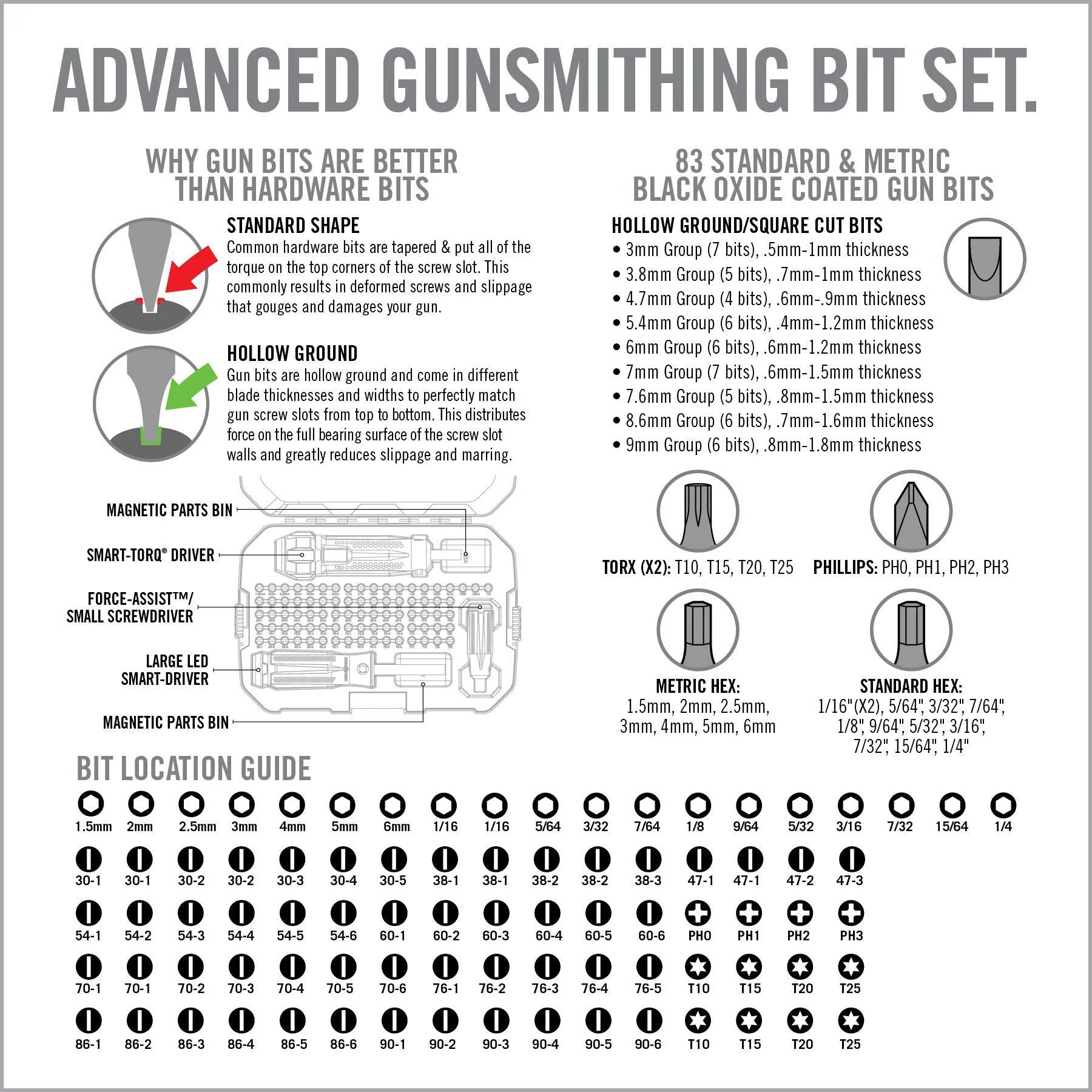 This intelligently designed Master Set includes both the Smart-Torq® and Smart-Drive® gunsmithing drivers. With ergonomic comfort grips, both drivers fully integrate with the multi-purpose Force Assist™ driver. Smart-Torq features easy to see and set 1 in-lb increments. For non-torque applications the Smart Drive will be your go-to for not only gunsmithing work, but any tasks around the house or shop. Smart-Drive has a free spinning cap for applying additional downward pressure and an LED light for dark spaces. Completing the set are 83 standard and metric black oxide coated gun bits. Gun bits are hollow ground and square cut for precise fitment.