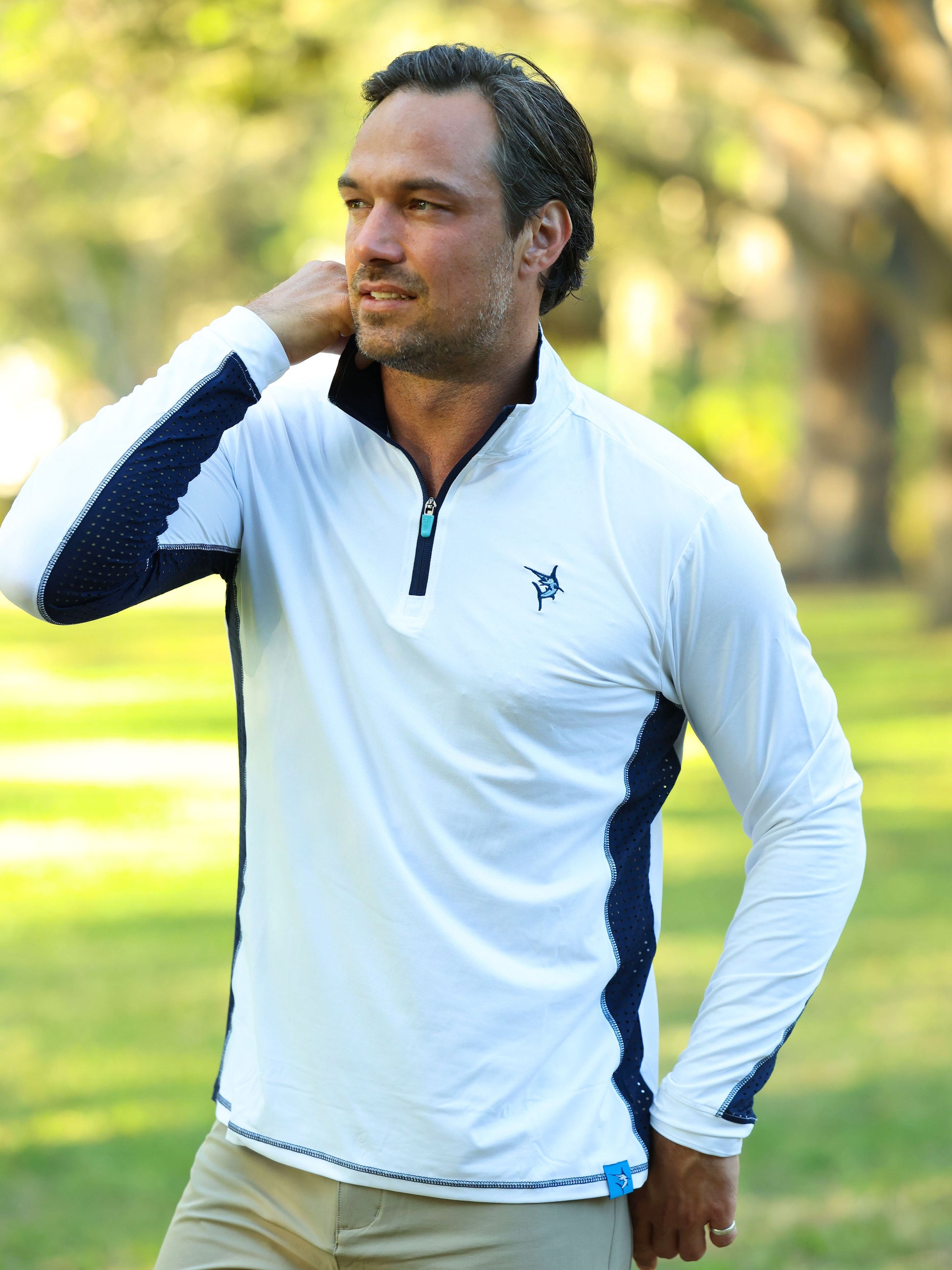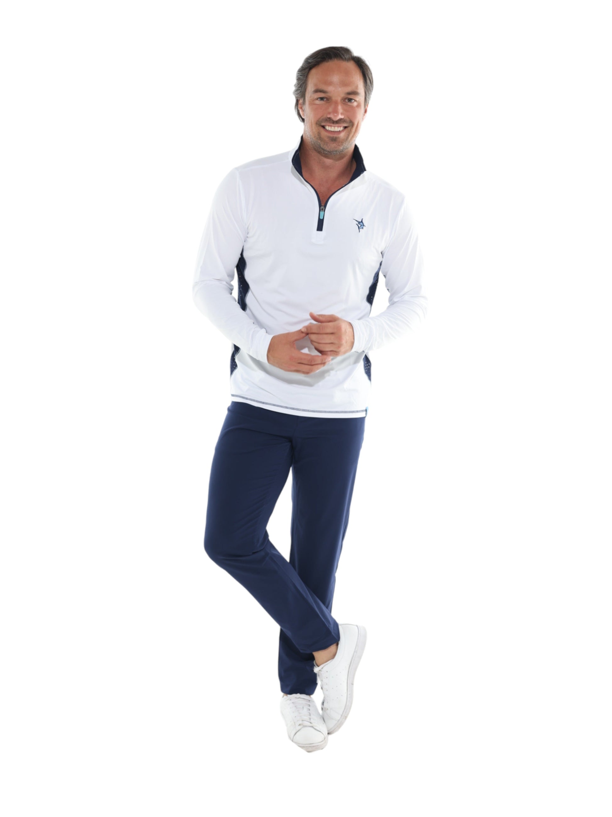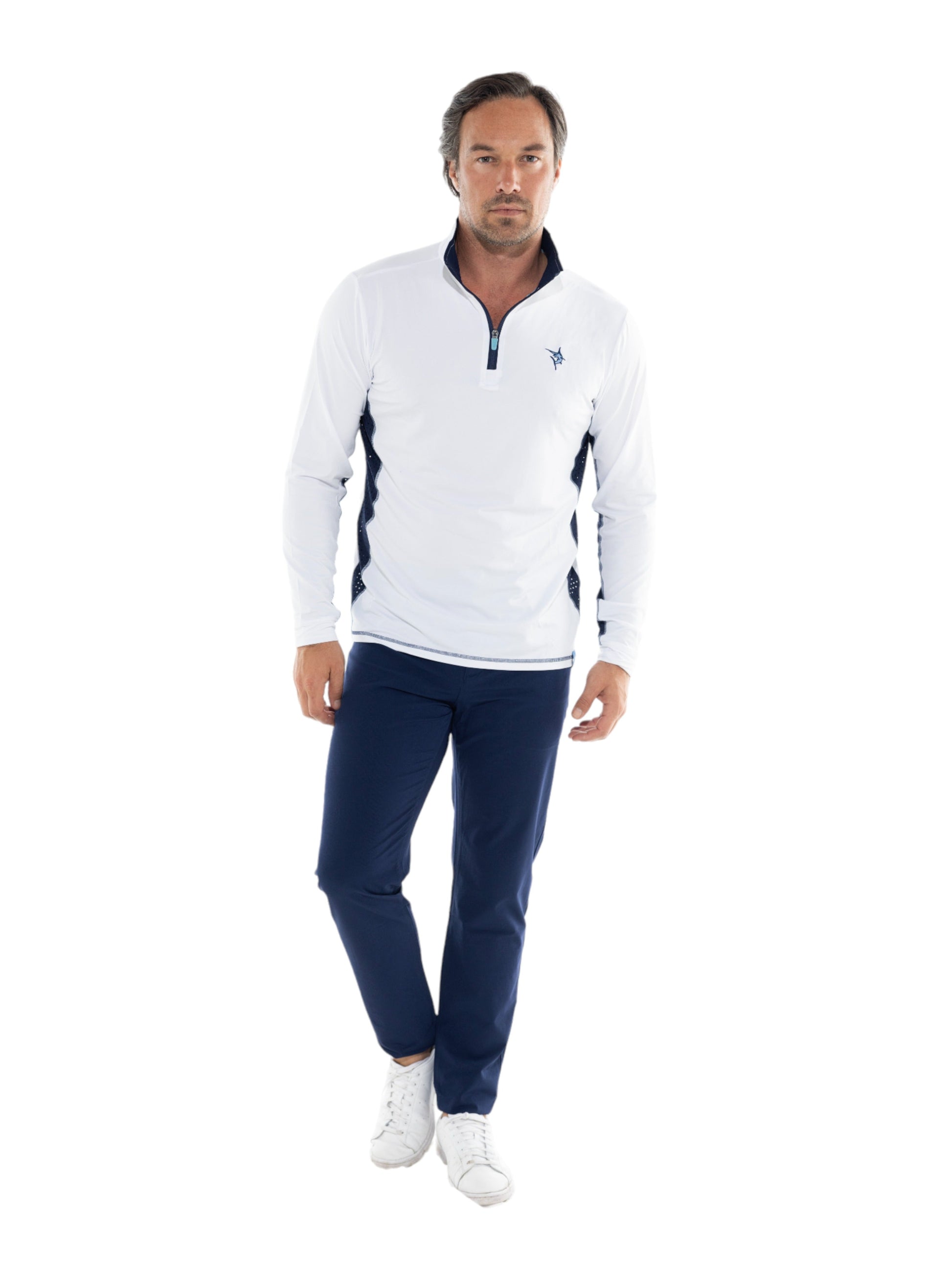 Light weight performance quarter zip featuring soft poly spandex wicking fabric. Sun Protection, UV50 with laser insert venting to keep you cool when needed and patented silicone sleeve grip which holds your sleeves in place and keeps them clean. The stylish Southport also features contrast collar, cuffs, and venting. Perfect for every day.