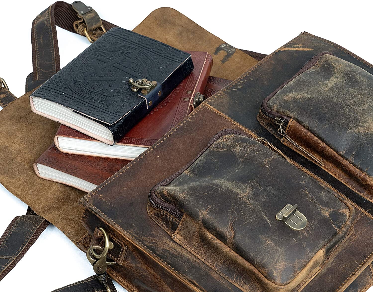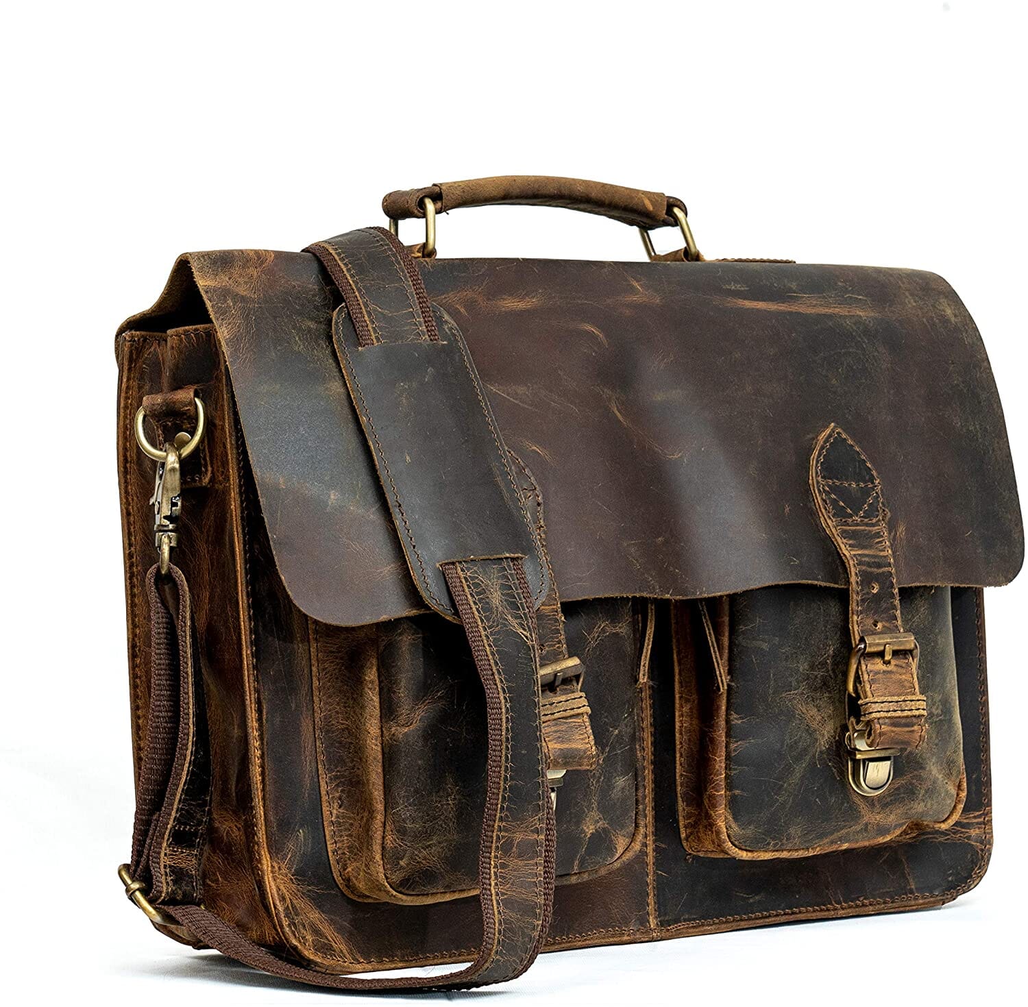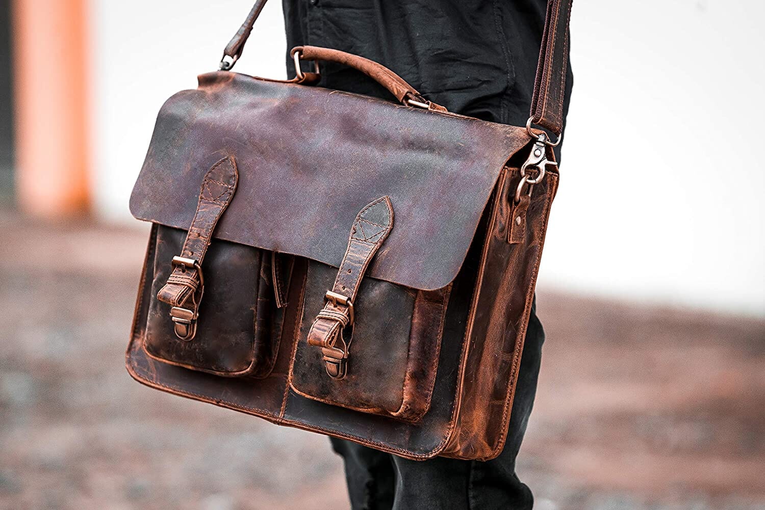 - Naturally treated, strong Buffalo leather, and a sturdy canvas lining inside. Fits up to a 17.2-inch laptop; rustic vintage look concealed snap closures for easy access; adjustable shoulder strap.