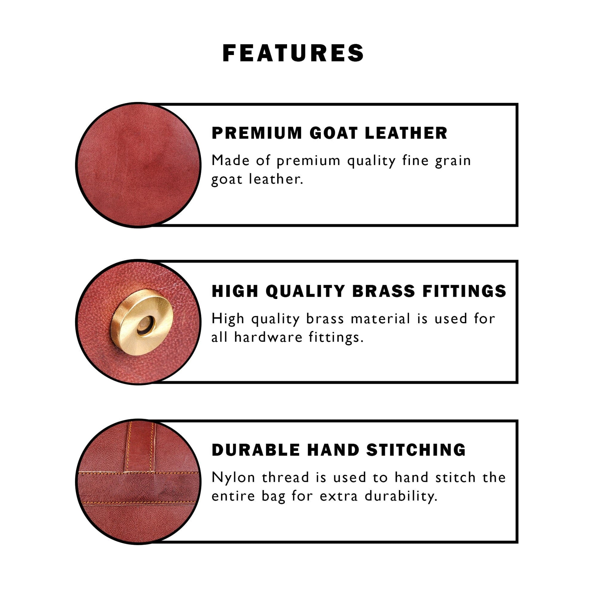 This uber-stylish bag is made from the finest quality goat leather and embellished with running stitches. We offer excellent craftsmanship to ensure uniqueness and exclusivity. We are glad to let you know that all the procedures followed for tanning the skin are natural. Thus, it’s environment-friendly and devoid of harmful chemicals. The vintage-looking, semi-glossy surface of the messenger bag is water- and scratch-resistant. It is underlined by a high-quality canvas, thus giving it a neat internal finish.