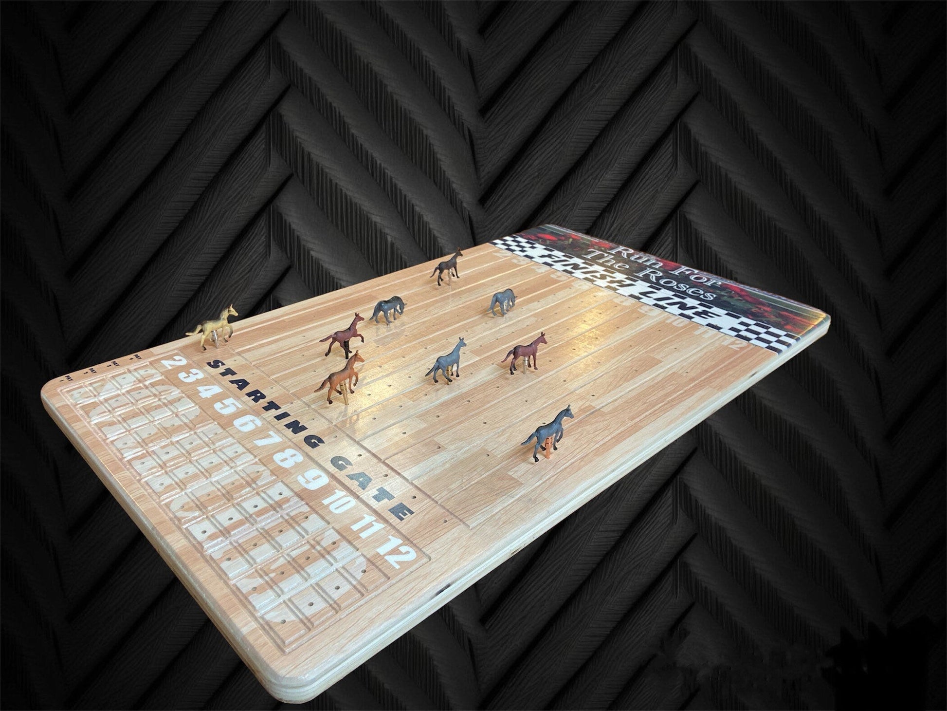 Beautiful custom printed (no decal!) on 1” thick Furniture Grade hardwood horse racing game involving dice, cards, gambling, and optional drinking spaces. The night will never end! This game is addicting, so proceed with caution! Have loads of fun with a group of friends and make sure you are in a place where you can get noisy! We make these boards out of high grade 1” furniture grade birch hardwood, CNC cut and engraved, before they are printed on a UV direct printer (right onto the wood surface (no decals or stickers). The design options are unlimited so let your imagination run wild as we can make it a reality with our high-tech equipment and machinery.