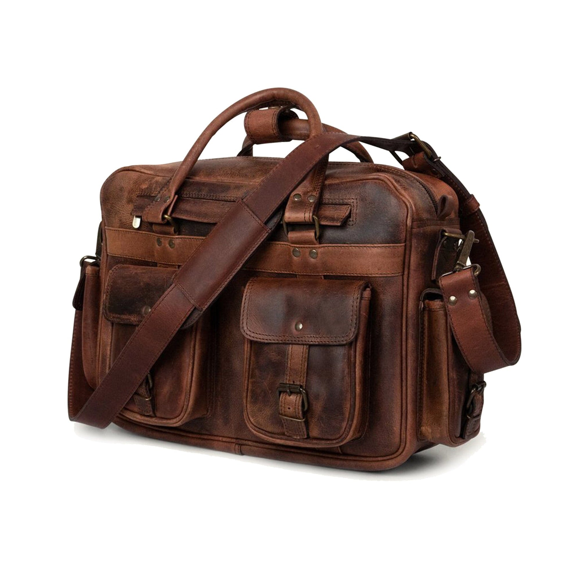 Our Wilson Leather Pilot Briefcase is crafted from water buffalo hide, has a green canvas-lined interior, and genuine brass and iron hardware. It’s 16" long, 12 high, and 5" wide, the ideal size to hold a 15" laptop. Designed with four buckled exterior pockets and a roomy interior with zippered pockets, this bag is designed to securely hold the items you need to bring along on your travels.