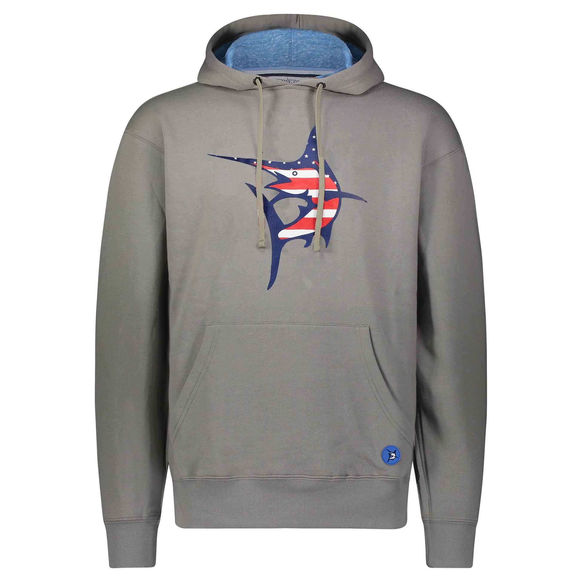 Georges Bank in the northeast is famed for its adventure and the game fish that live on the bank. This hoody is made of double brushed cotton fleece for ultra softness. Inside the hood you will find our icon logo sublimated into the fabric and our USA Icon logo embroidered onto the front chest. A great fleece hoody for any adventure.
