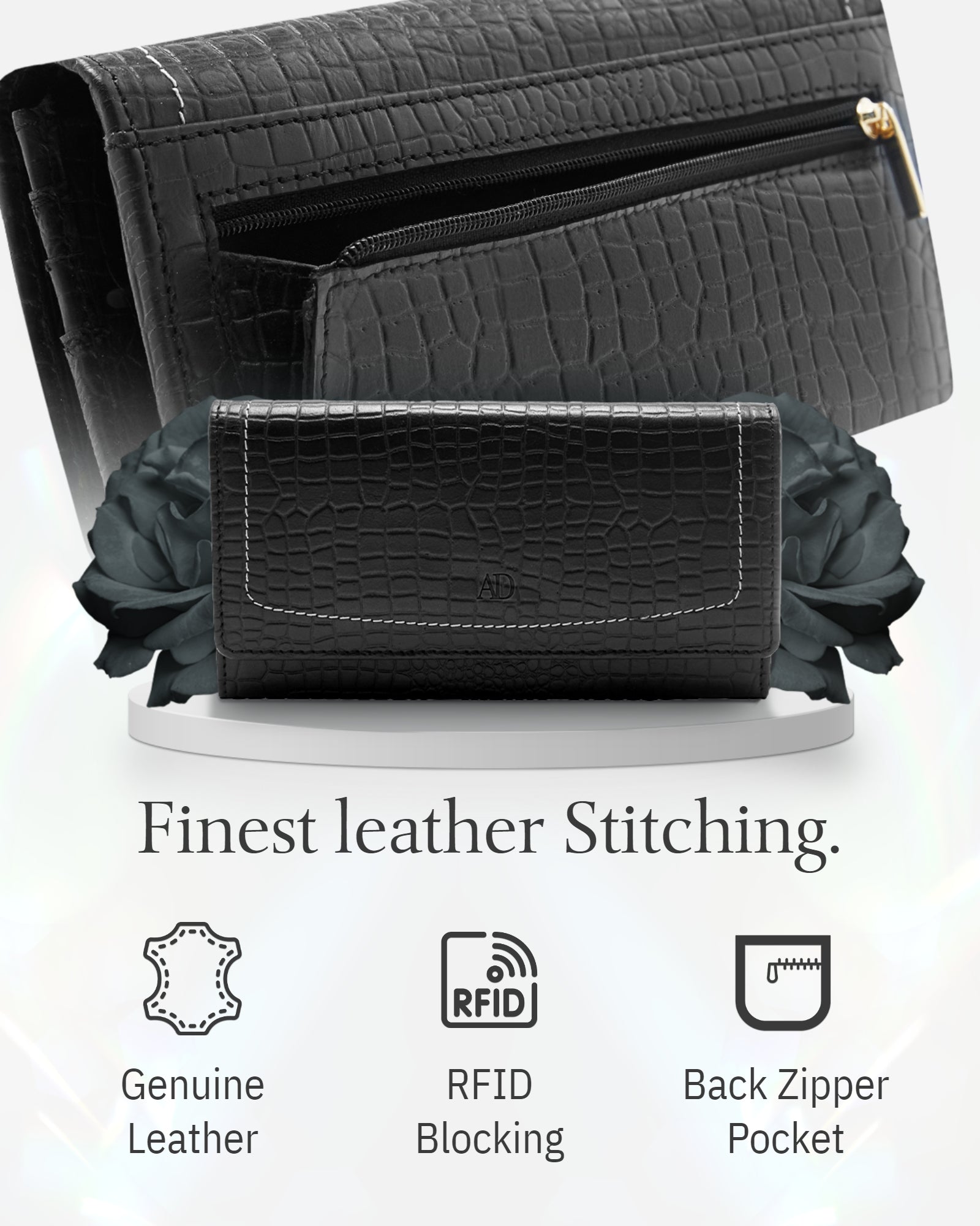This Wallet has 12 credit card slots, an ID Window, an interior zippered pocket, an exterior zippered coin pocket, and multiple cash compartments.