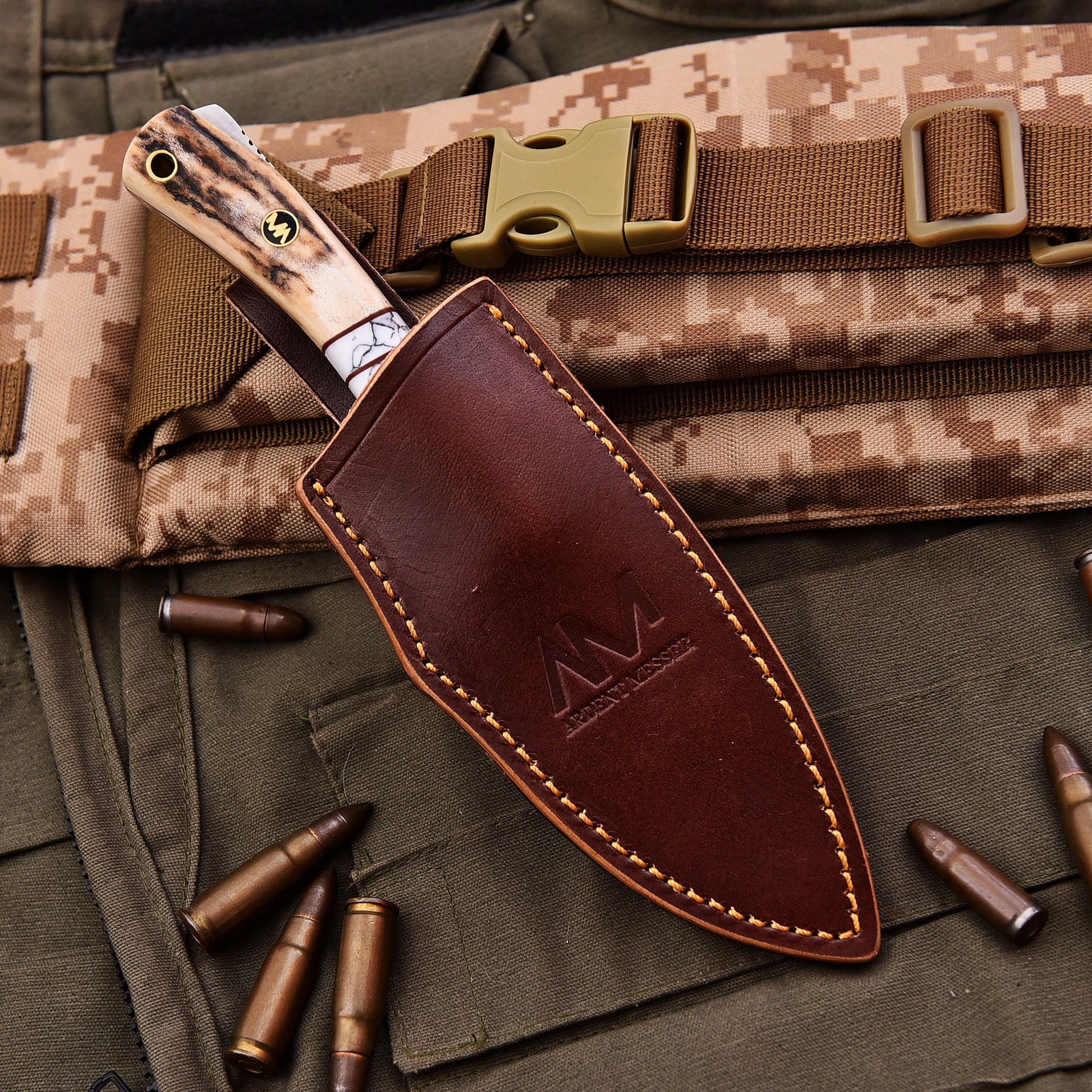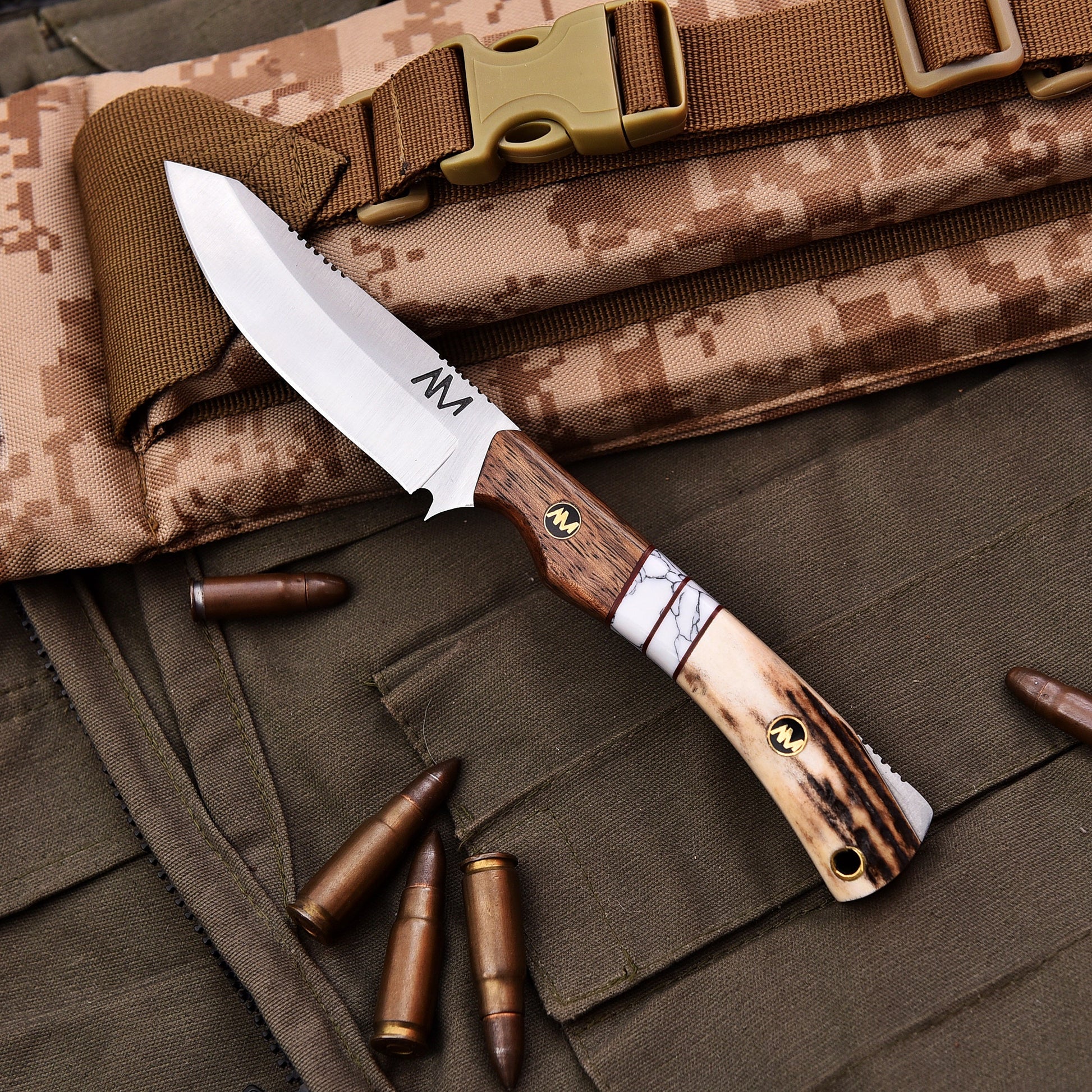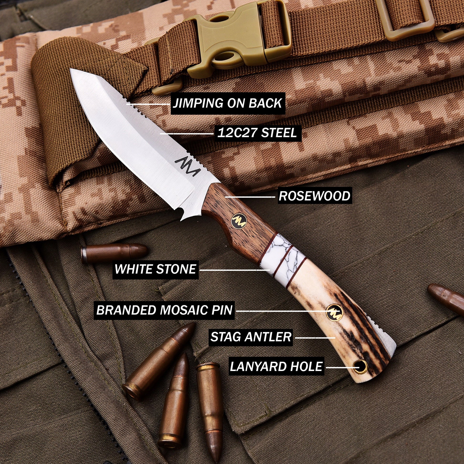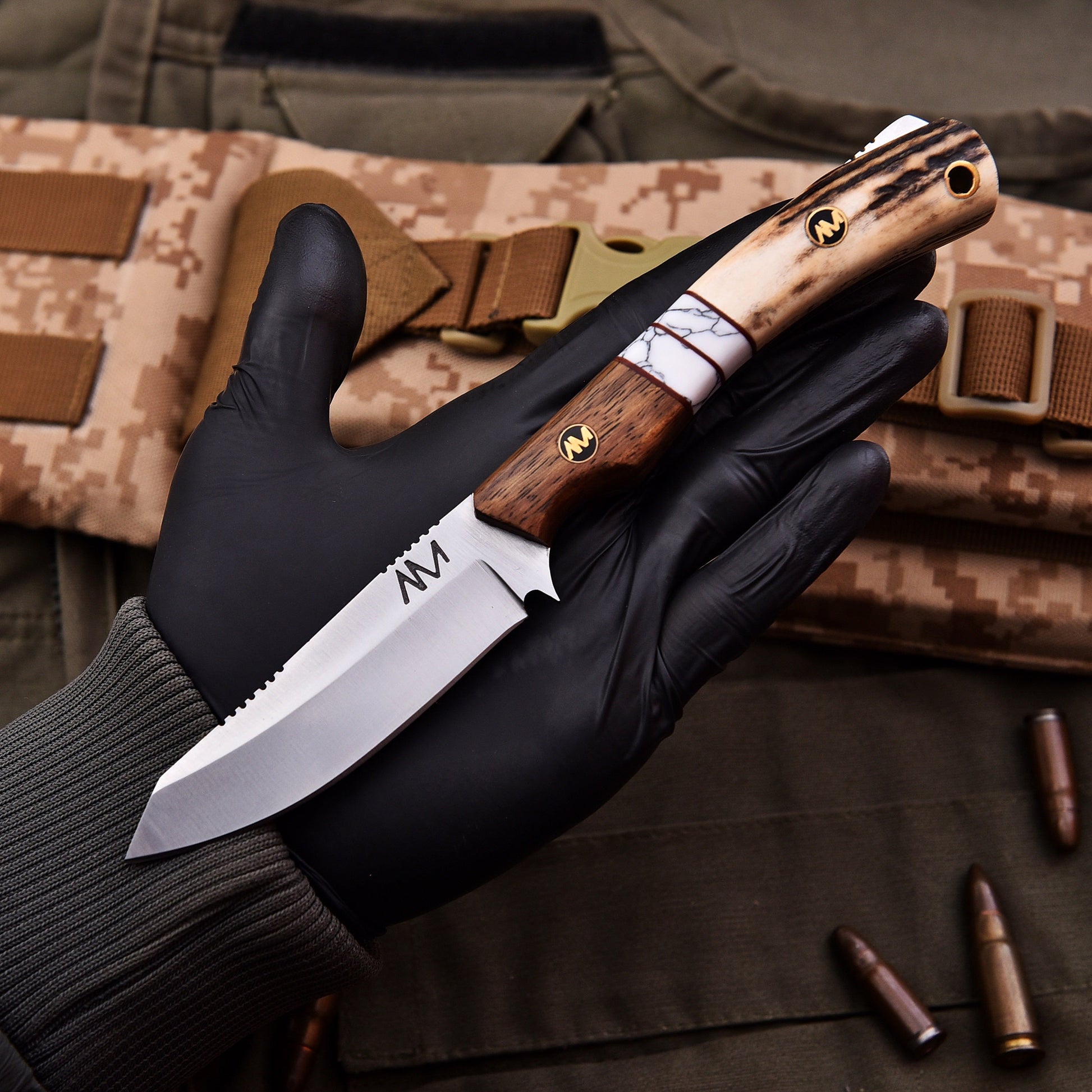 The AM Phantom is a masterfully crafted fixed blade designed for precision, strength, and elegance. Featuring a razor-sharp stainless steel blade with a clip point profile, this knife offers exceptional slicing power and tip control for hunting, camping, and tactical tasks. Its handle combines rich natural wood, genuine stag, and a striking white marble spacer for a unique and premium aesthetic. With ergonomic contours for a secure grip and the signature AM mosaic pins, the Phantom is not just a knife—it’s a statement of craftsmanship. Built for durability and performance, it’s ready to handle the wilderness while looking exceptional in any collection.