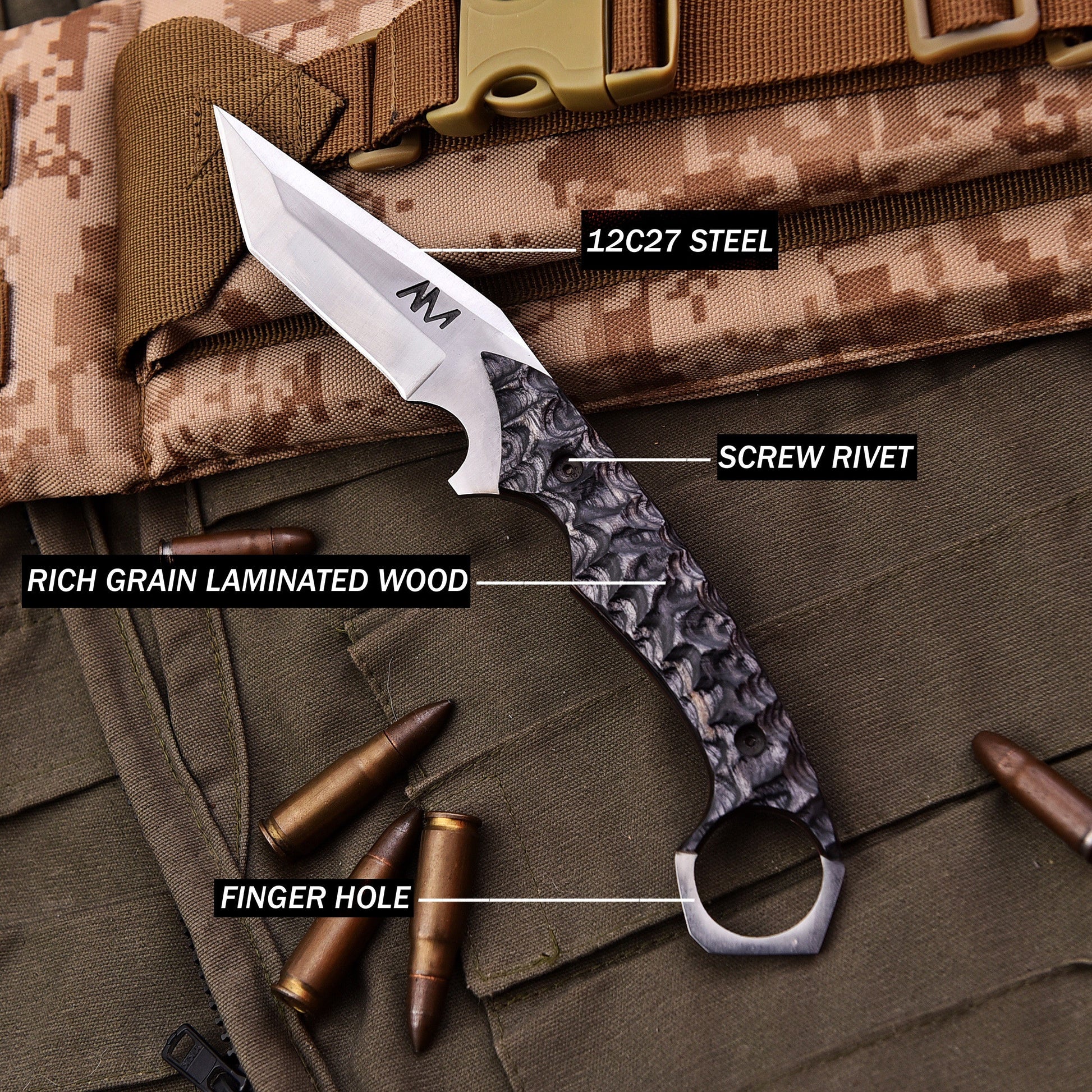 AM Sentinel Fixed Blade Tactical Knife with Finger Ring & Leather Sheath