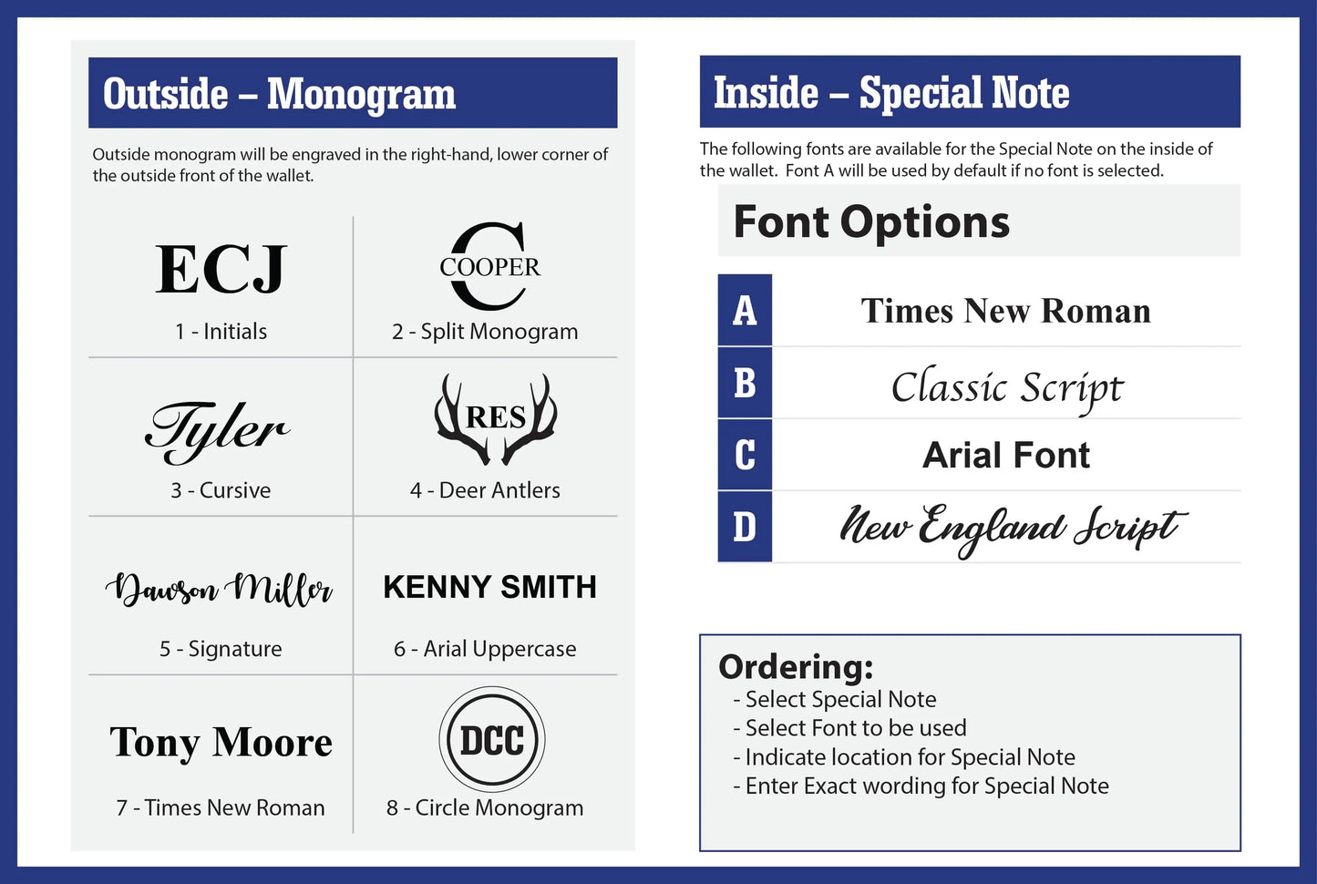 Customize your new wallet with a personalized motto to say what you want or leave as it is. We also offer personalized initials that can be engraved on the front pocket. You can also select to add a Custom ID Window, which we normally place on the right inside of your bifold wallet. It allows an open ID window slot to display your drivers license.