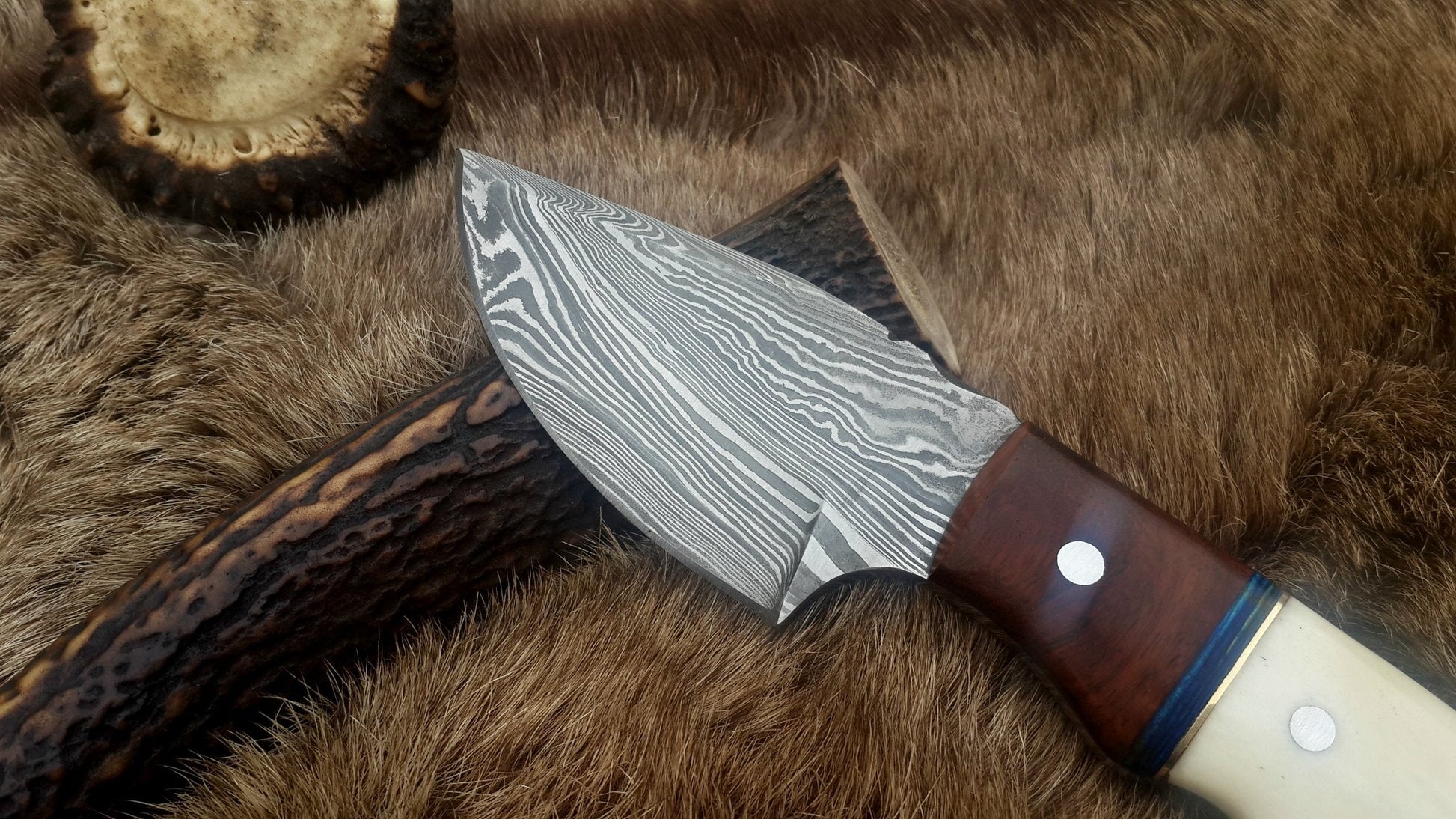 Damascus Steel Drop Point Skinning Knife with Bone and Rosewood Handle – 7 Inch Overall Length