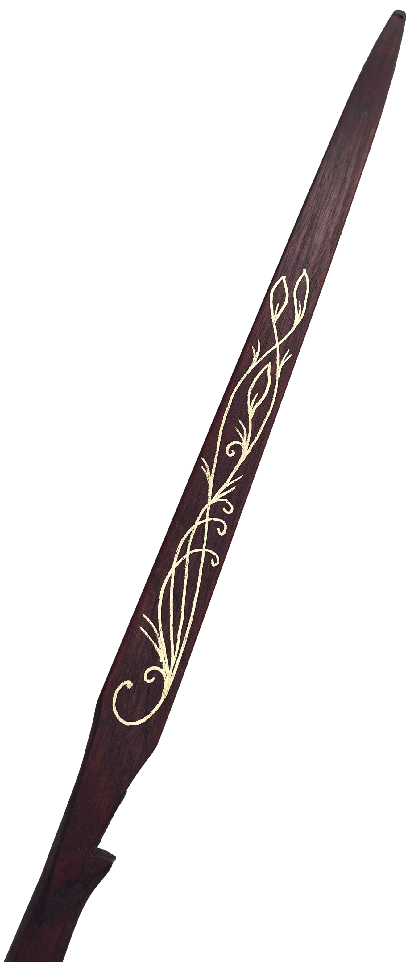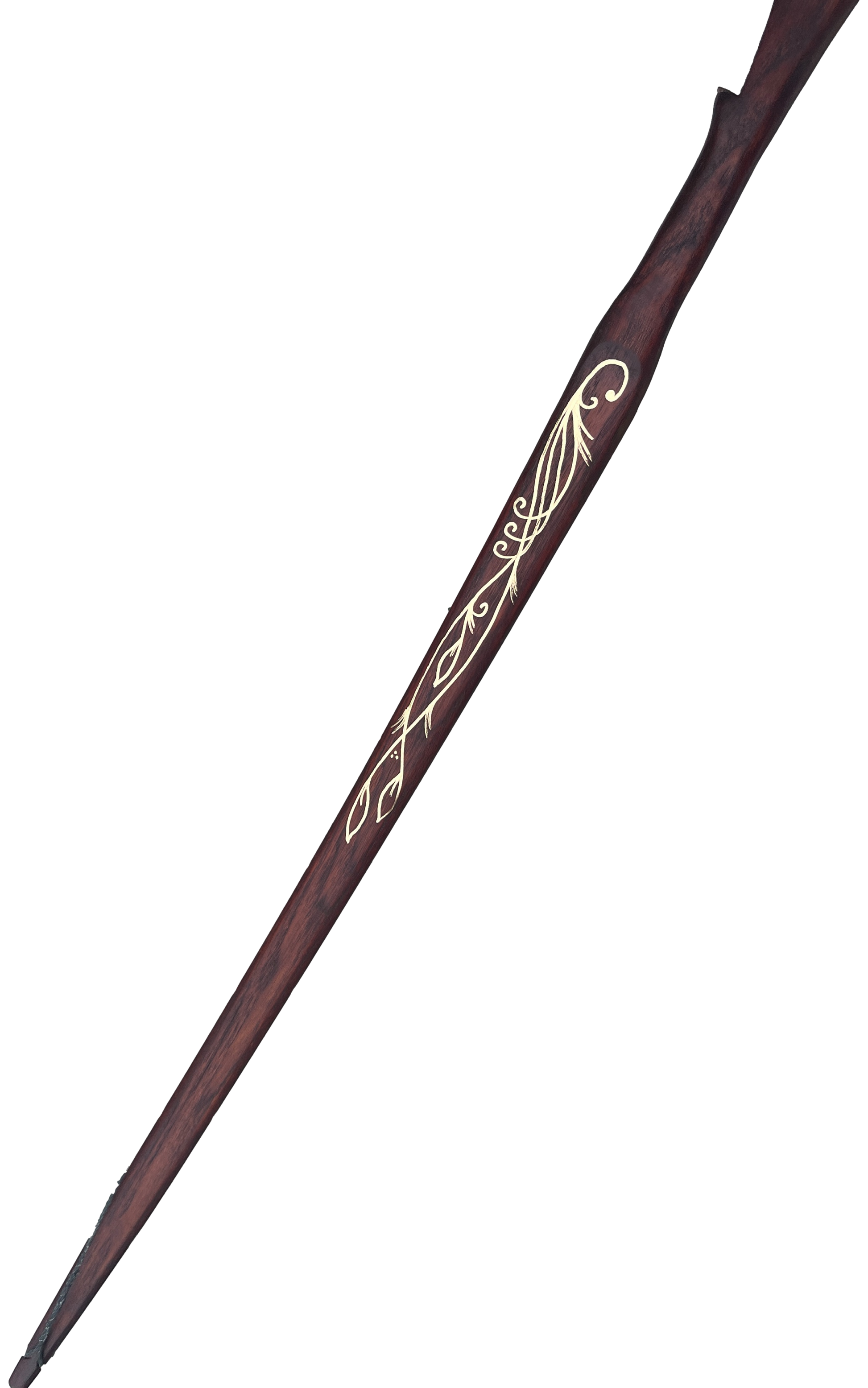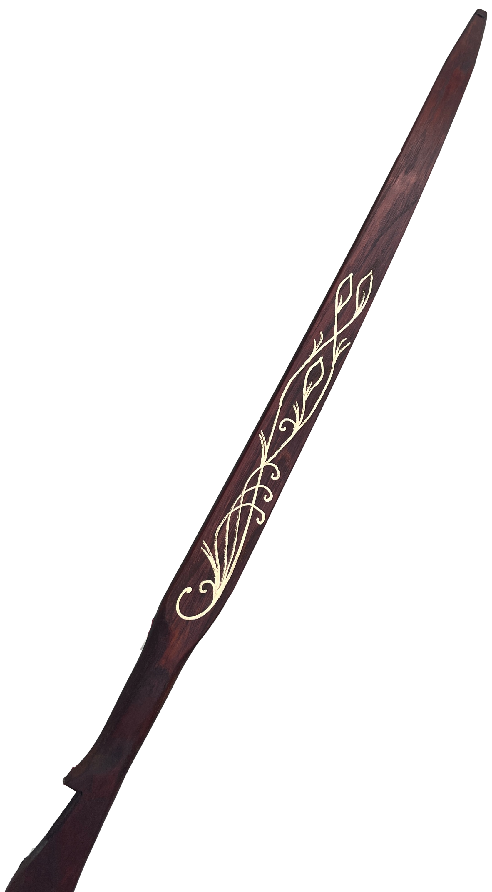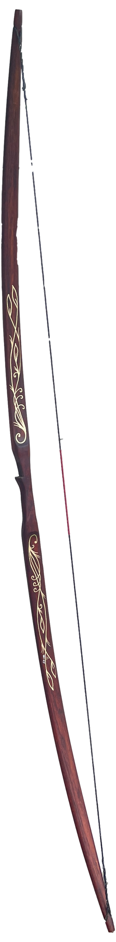 Inspired by the elves of the J.R.R. Tolkien and the Lord of the Rings movies, the Elven Army Bow was designed to capture the powerful yet beautiful bows that would have been carried by Elves. This is a very versatile bow, can be easily slung over your back to allow you to navigate through the woods and hills. Then simply pull back and take aim at your target. The Elven Army Bow is a uniquely handcrafted bow with beautiful golden artwork to truly capture the essence of the elves and the power of a fully functional longbow. Each bow has a leather dark brown stain and painted with gold accents. If you wish, your name can be painted below the banner as well.