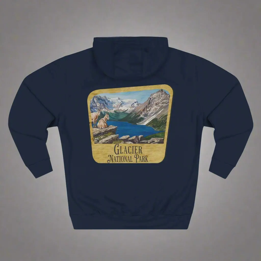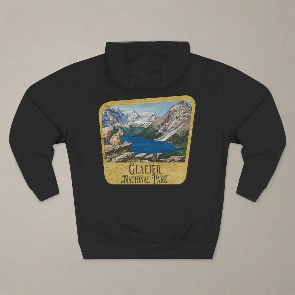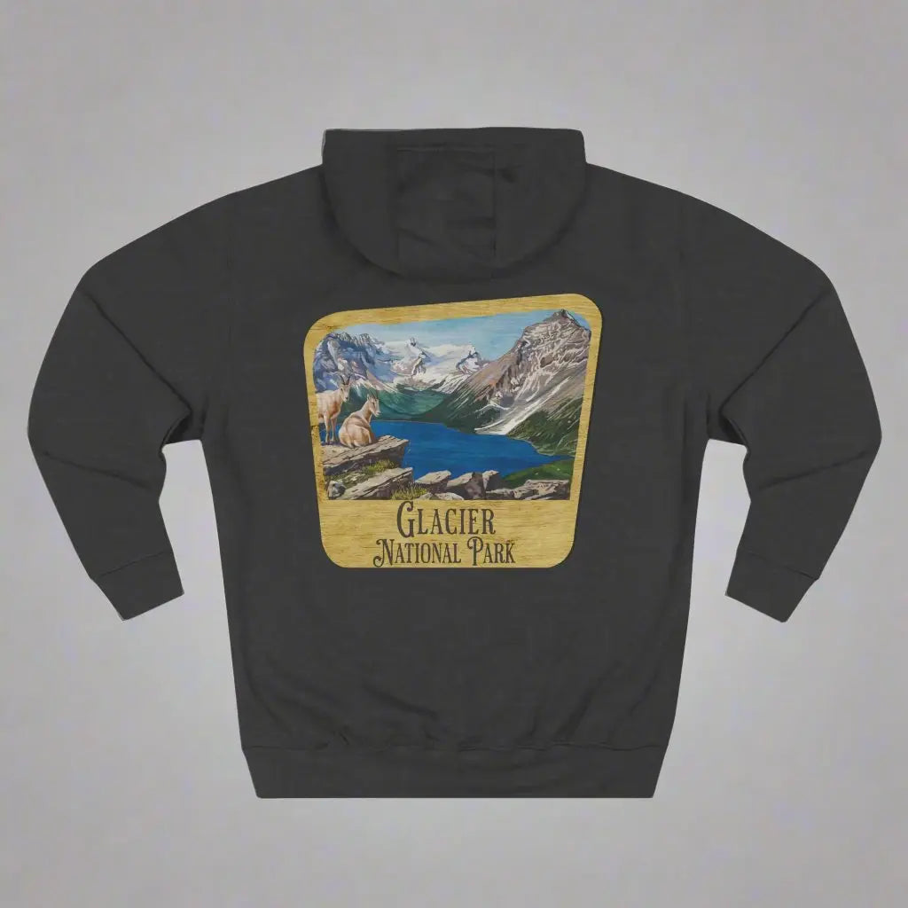 Glacier National Park Unisex Fit Fleece Hoodie Scenic Mountain Goat View Graphic Wooden Sign