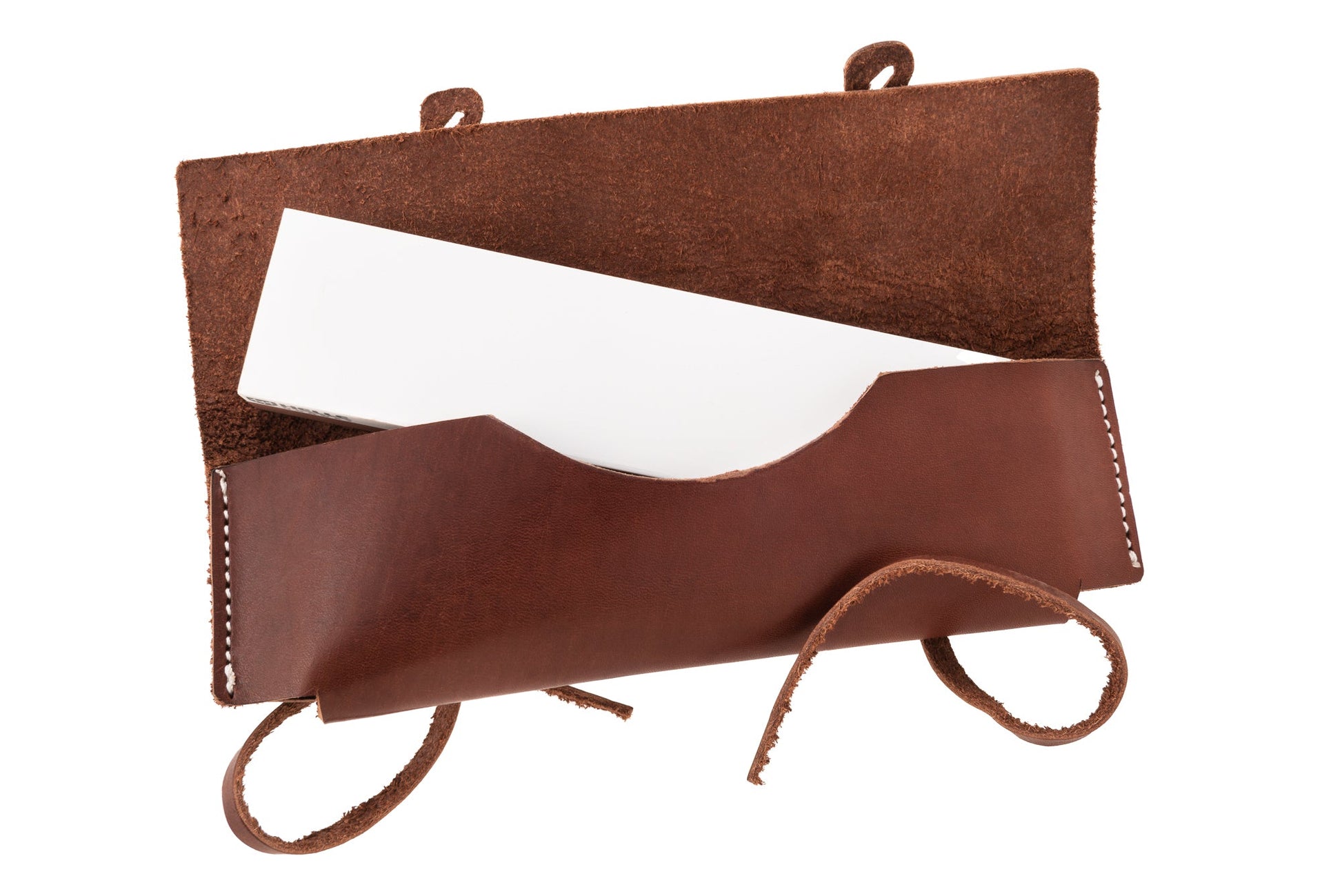 The double-sided stone has 360 grit on one side for the coarse tasks and a fine 1000 grit stone on the other for the right finish. It comes in a practical leather casing that makes it easy to find and store away.