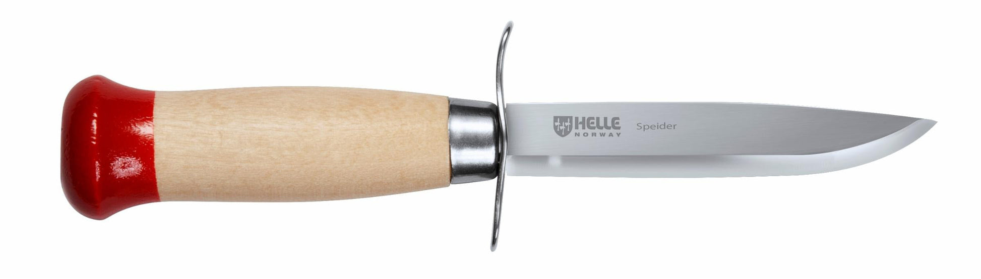 The Helle Speiderkniven is the standard Norwegian scout knife. The name is fitting as Speider means Scout in Norwegian. It has a simple drop point blade and a stamped double cross guard. This knife would be best suited to someone with a small hand. The genuine leather sheaths are stamped with the image of either a Girl Scout or a Boy Scout. Both styles now come with a light brown sheath. Please specify your preference in drop down box