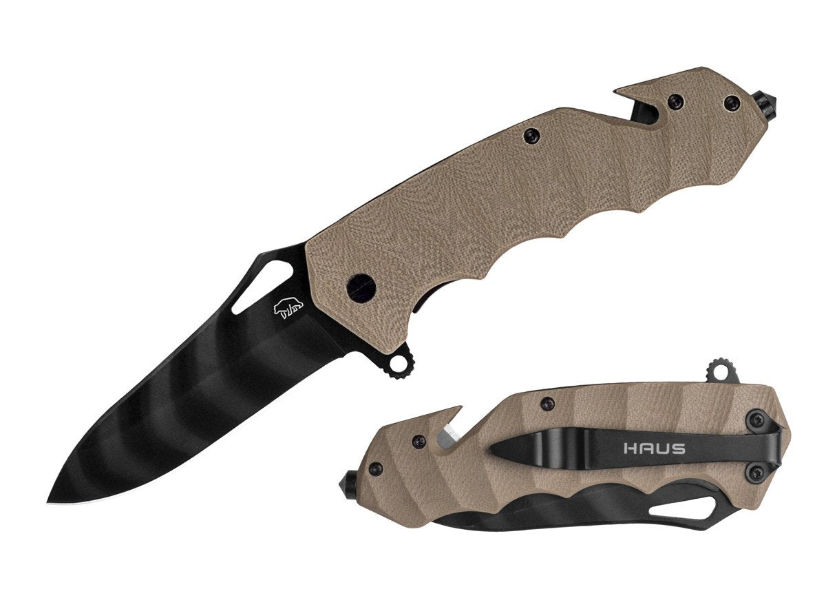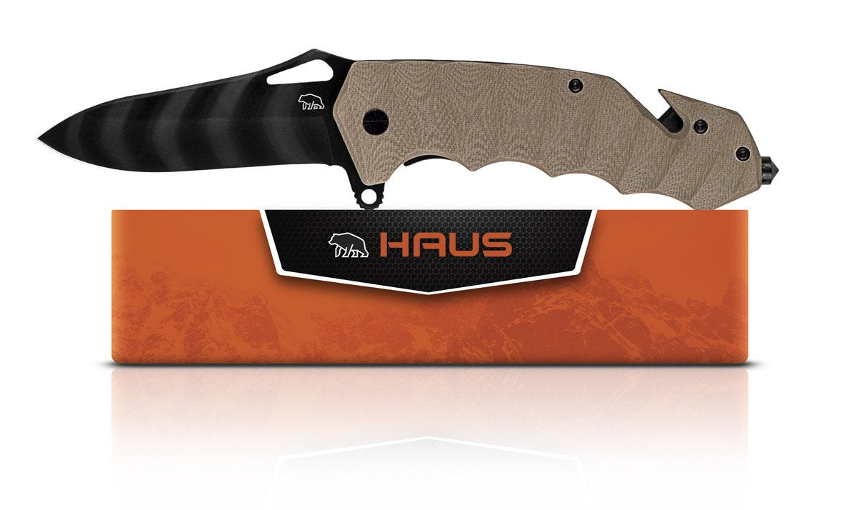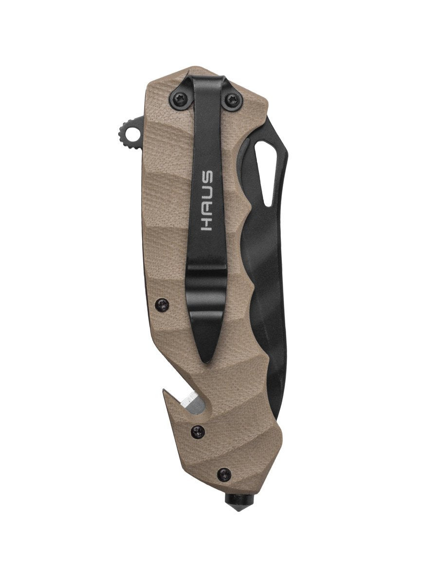 The HAUS Kodiak Tactical Folding Knife features a 3.75-inch, 3-millimeter thick faded tiger striped blade and a 4.75-inch scaled G10 handle. This smooth opening folding knife locks securely into place using a reliable liner lock system. You can safely and easily secure the knife to your belt or pocket with the sturdy belt clip included. This knife comes with a glass breaker and cord cutter for any emergency situation. The Kodiak has a rugged, tactical style and the comfortable G10 handle makes this knife perfect for any tactical situation!