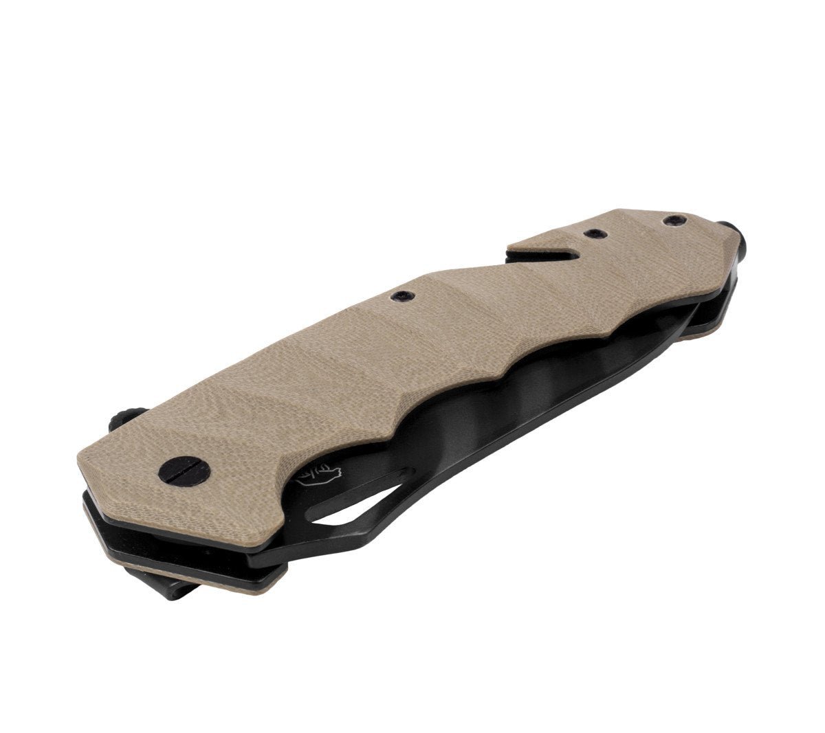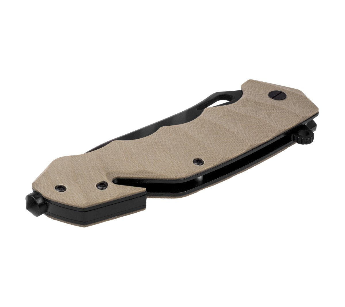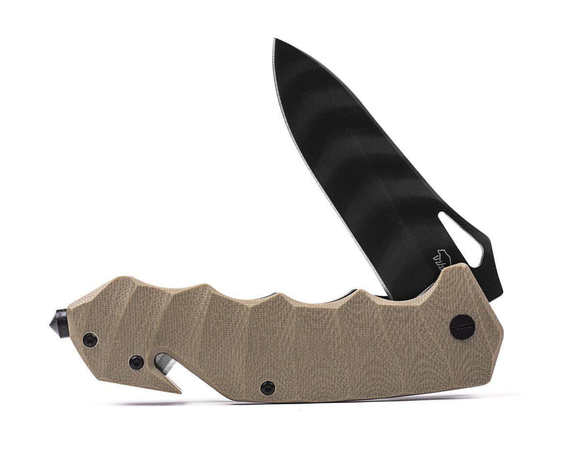 The HAUS Kodiak Tactical Folding Knife features a 3.75-inch, 3-millimeter thick faded tiger striped blade and a 4.75-inch scaled G10 handle. This smooth opening folding knife locks securely into place using a reliable liner lock system. You can safely and easily secure the knife to your belt or pocket with the sturdy belt clip included. This knife comes with a glass breaker and cord cutter for any emergency situation. The Kodiak has a rugged, tactical style and the comfortable G10 handle makes this knife perfect for any tactical situation!