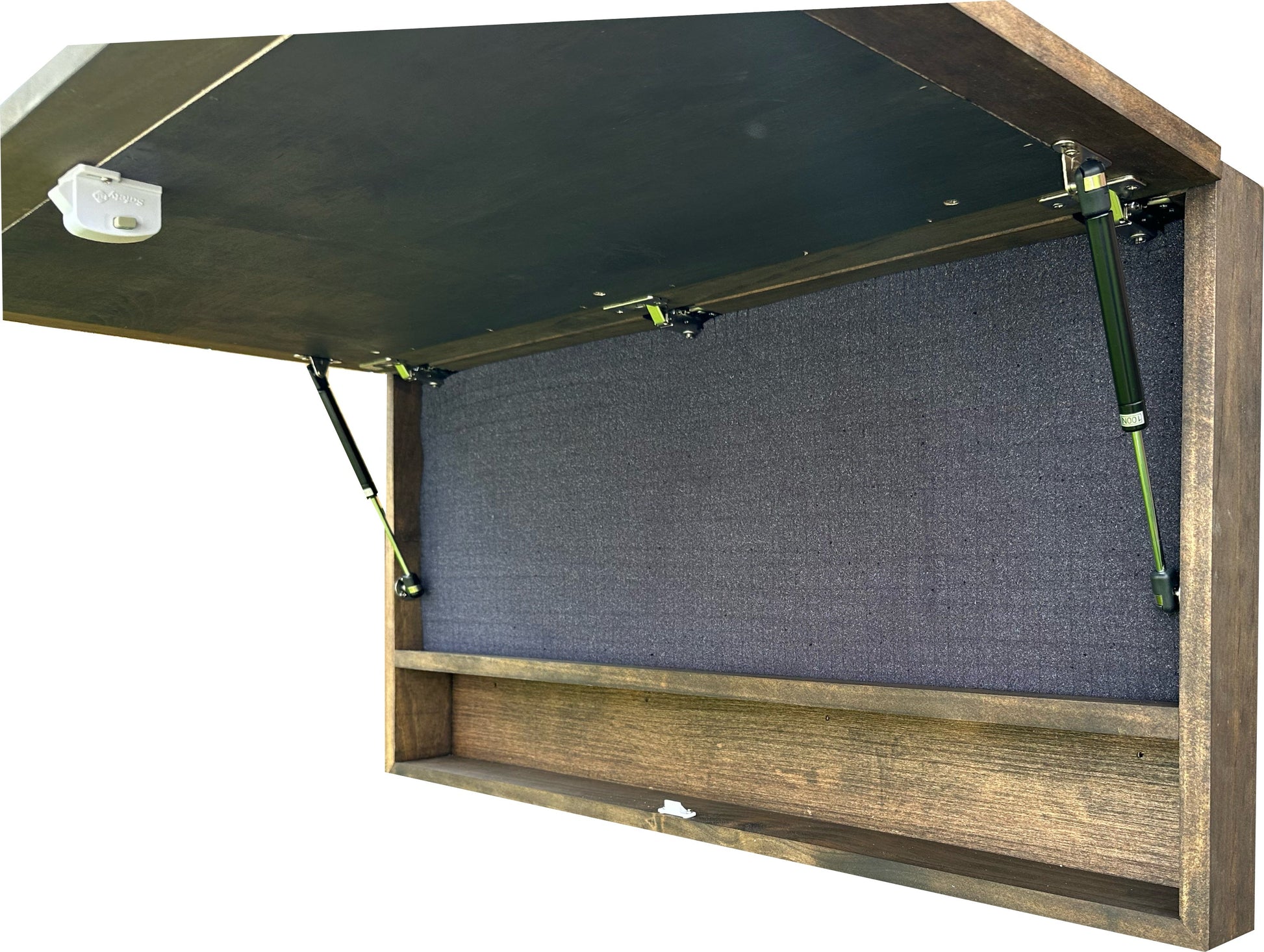 Securely store your gun and other home self defense gear inside the Bellewood Designs Large Hidden Gun Storage Cabinet Wolf Scene Decor - Two Wolves In The Woods. Your firearm and other tactical gear is easily accessible yet securely stored, so you'll never have to worry about leaving it unattended. Once you apply the key the lock immediately disengages and you're ready for self defense. This cabinet features a beautiful espresso frame, black maple background and eye-catching espresso 3D two wolves in the woods scene. The cabinet will be a focal point of any room and no one will ever know what's inside!