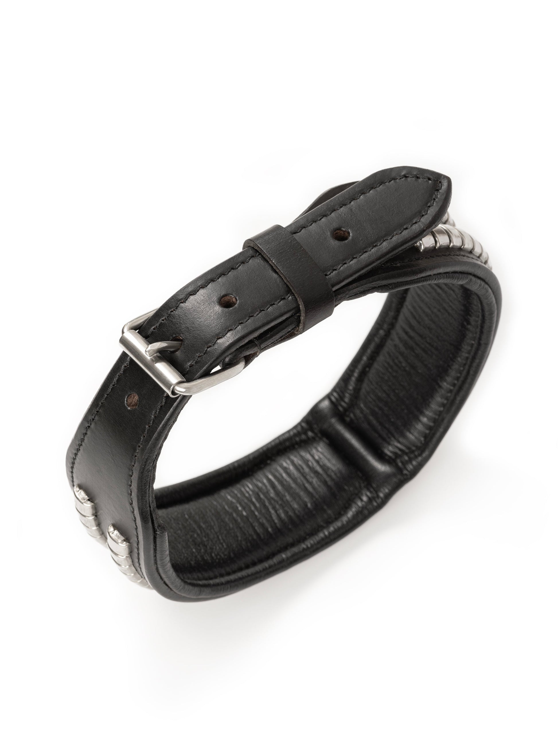 - Colour and Pattern: Black with stainless steel studs.