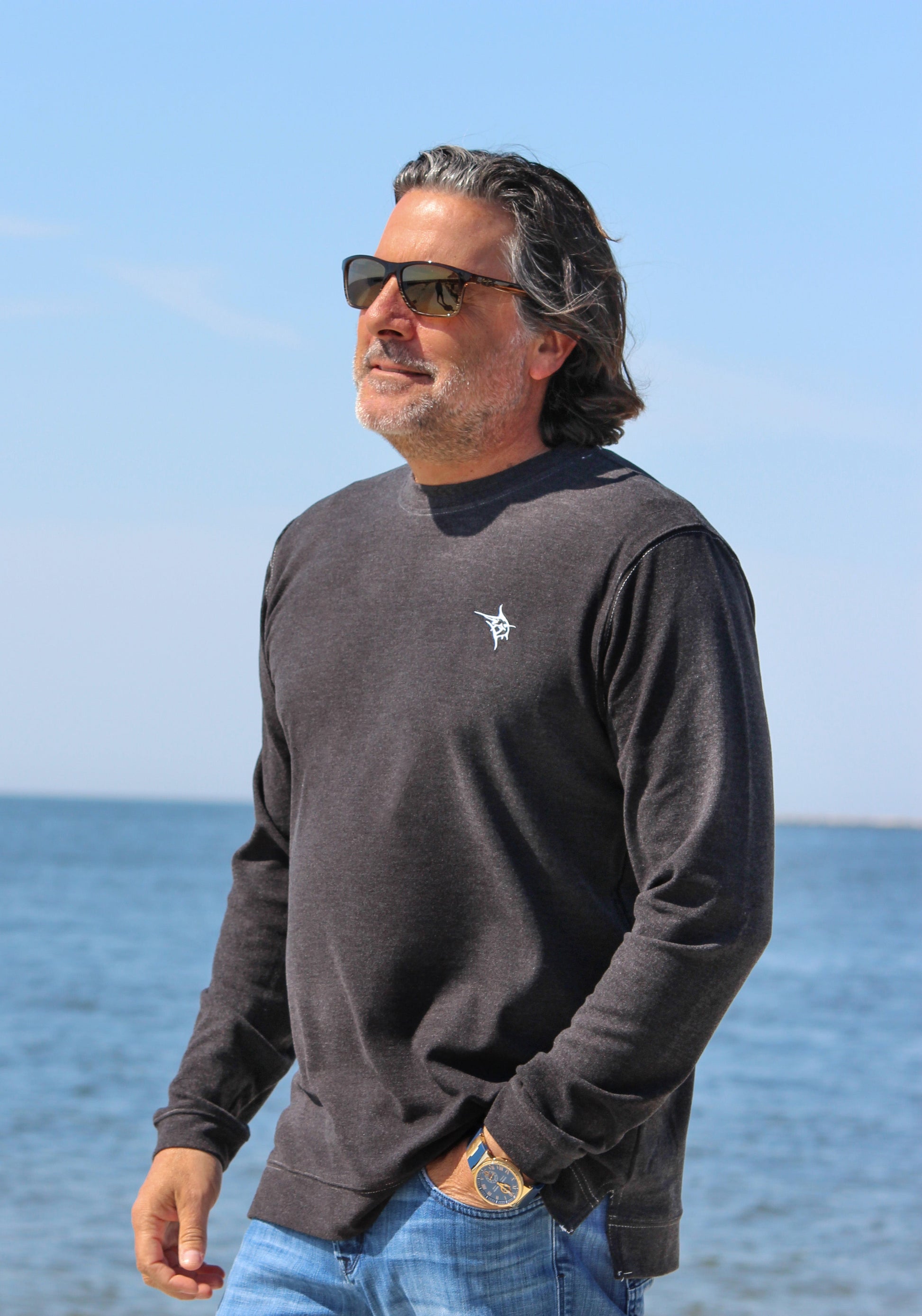 New crewneck with super fabric and look. Featuring a lightly fleece lined inside and super soft outside. Contrast stitching and classy v-notch at the side hem. Ultimate comfort in this versatile crewneck with four-way stretch. Slightly heavier than a long sleeve shirt and lighter than a sweater. This is a hybrid crewneck which is both stylish and comfortable.