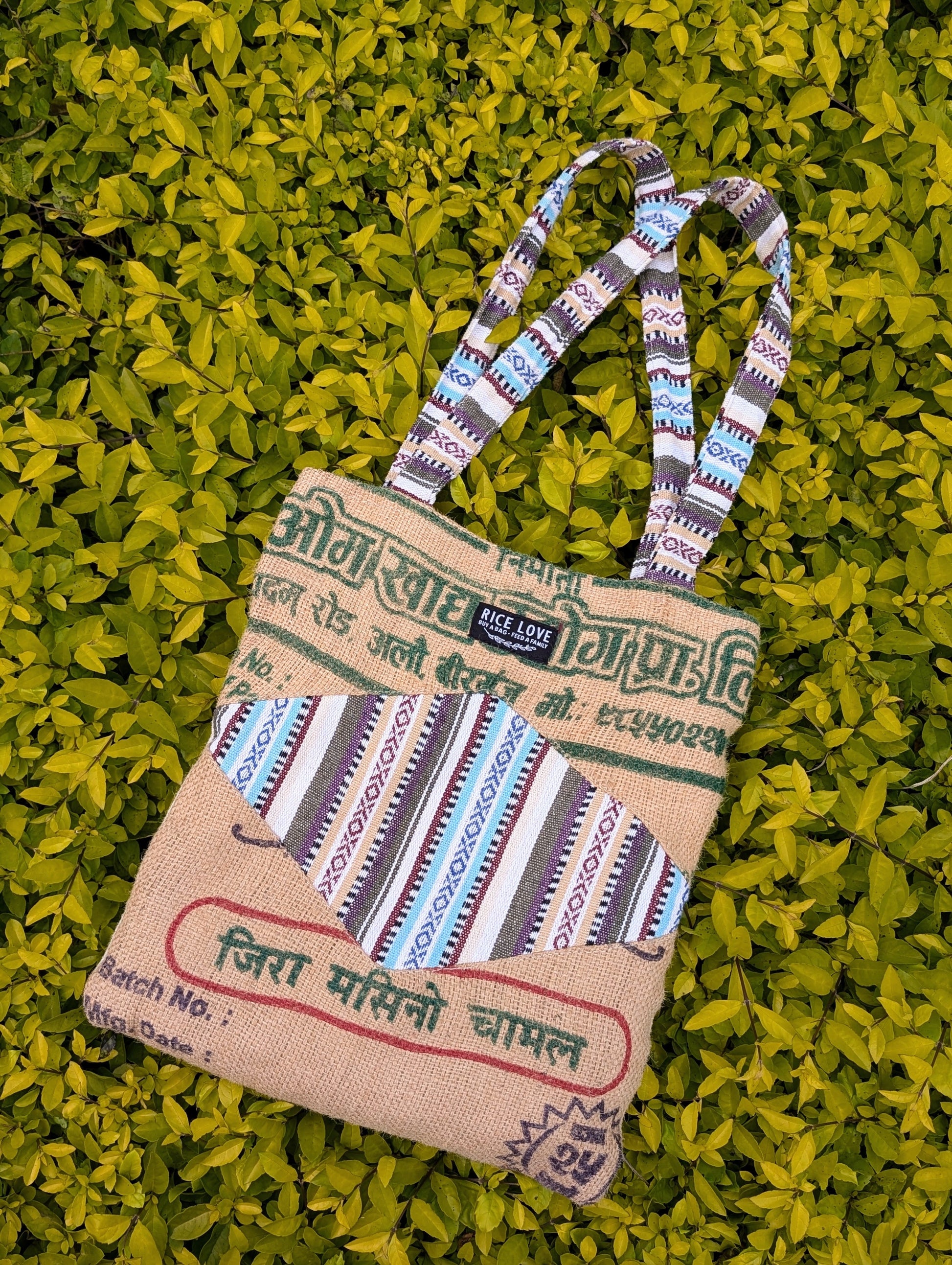 The totes shown are examples. Because each one is made from recycled rice bags, your tote will be completely unique. The exact colors and design will be a surprise - but we promise you’ll love it.