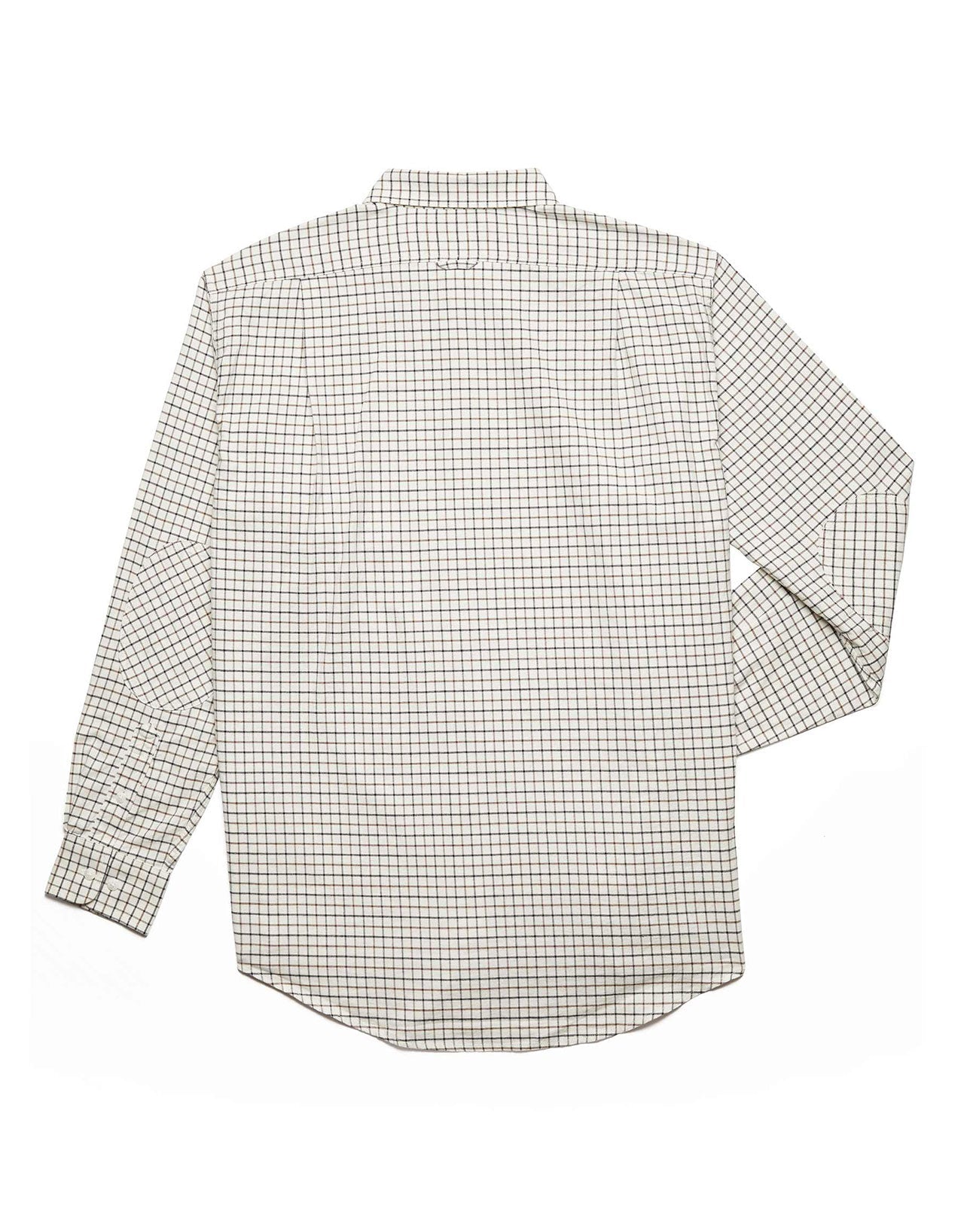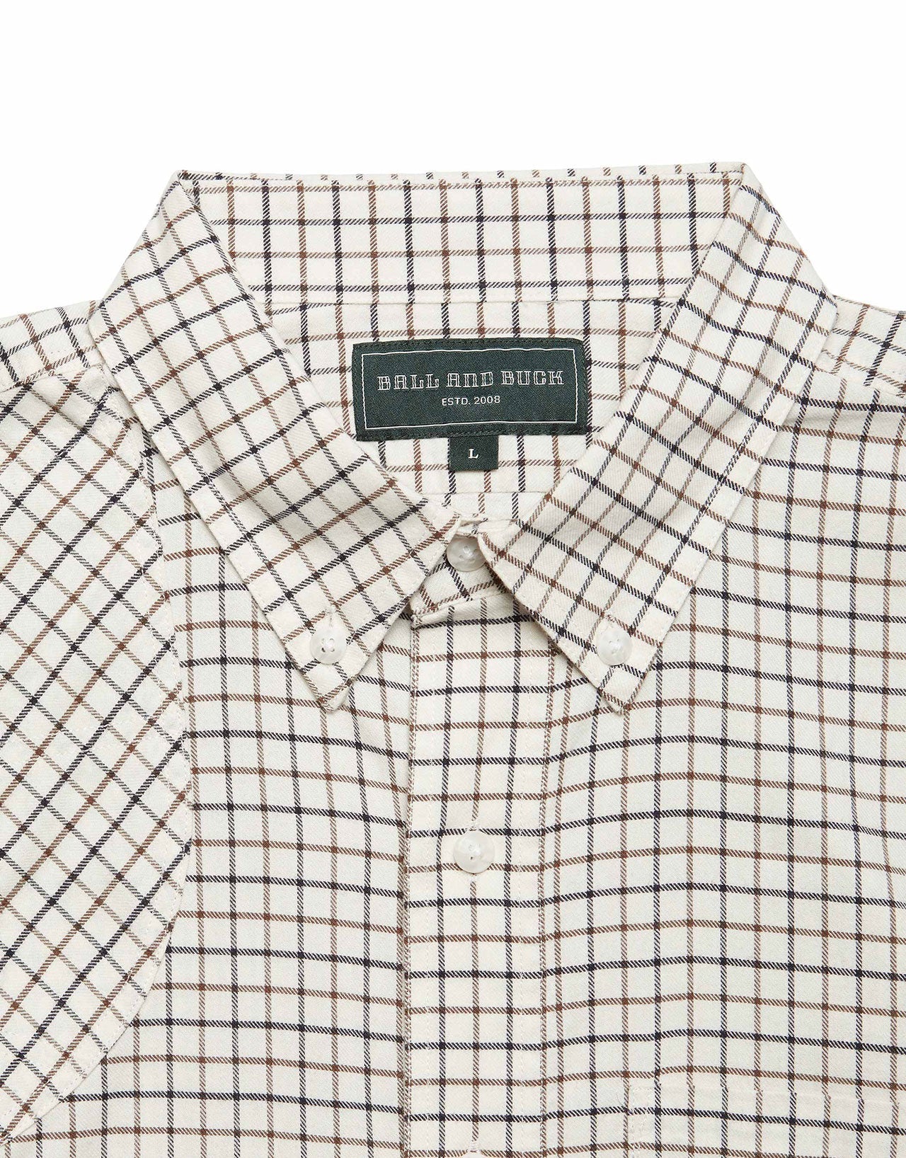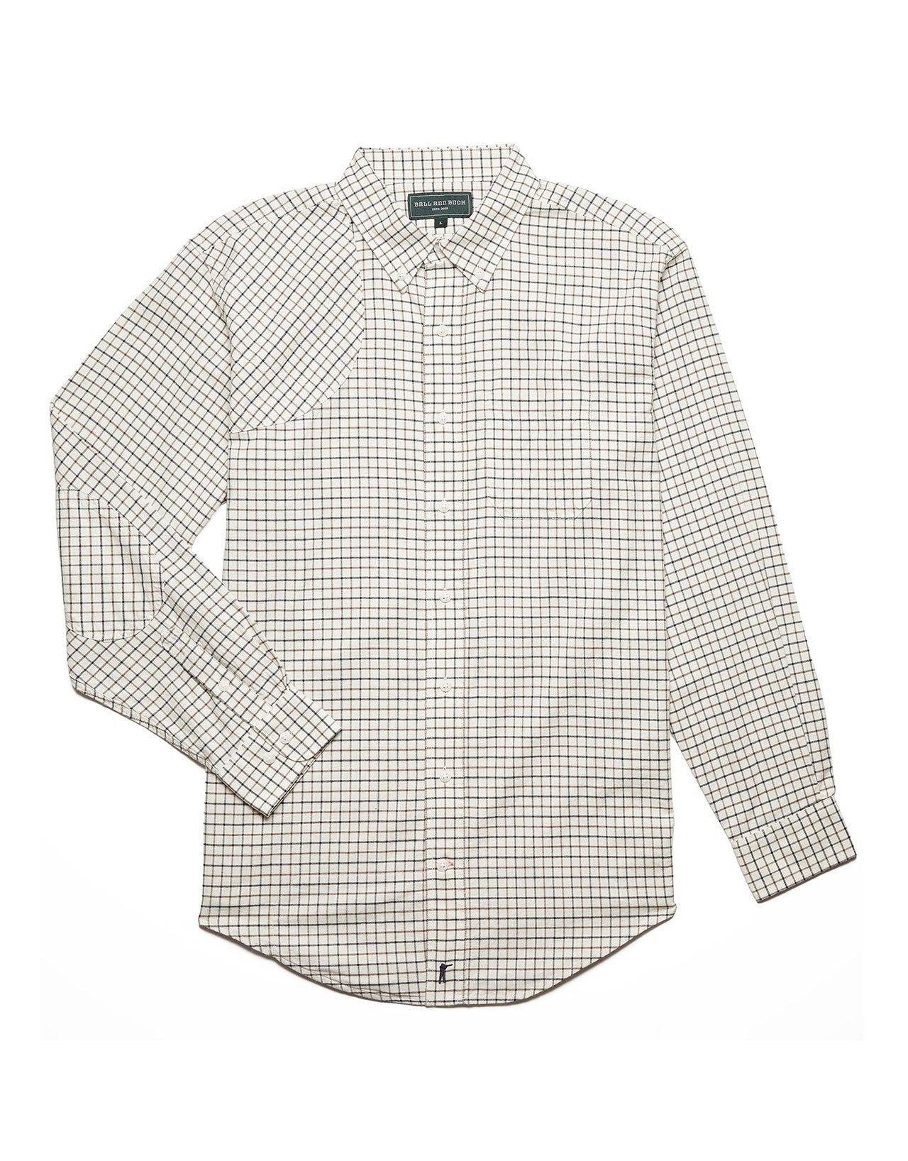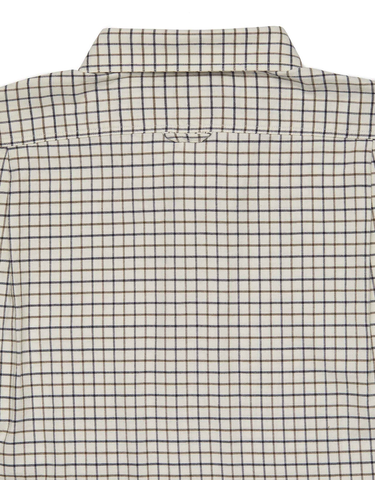 Our Sportsmans Shirt in Tattersall Plaid is a 3-season sport shirt crafted from 4.2 oz cotton and brushed for softness. The pattern features an ivory base color with Dark Tan and Navy stripes for versatility in any season.