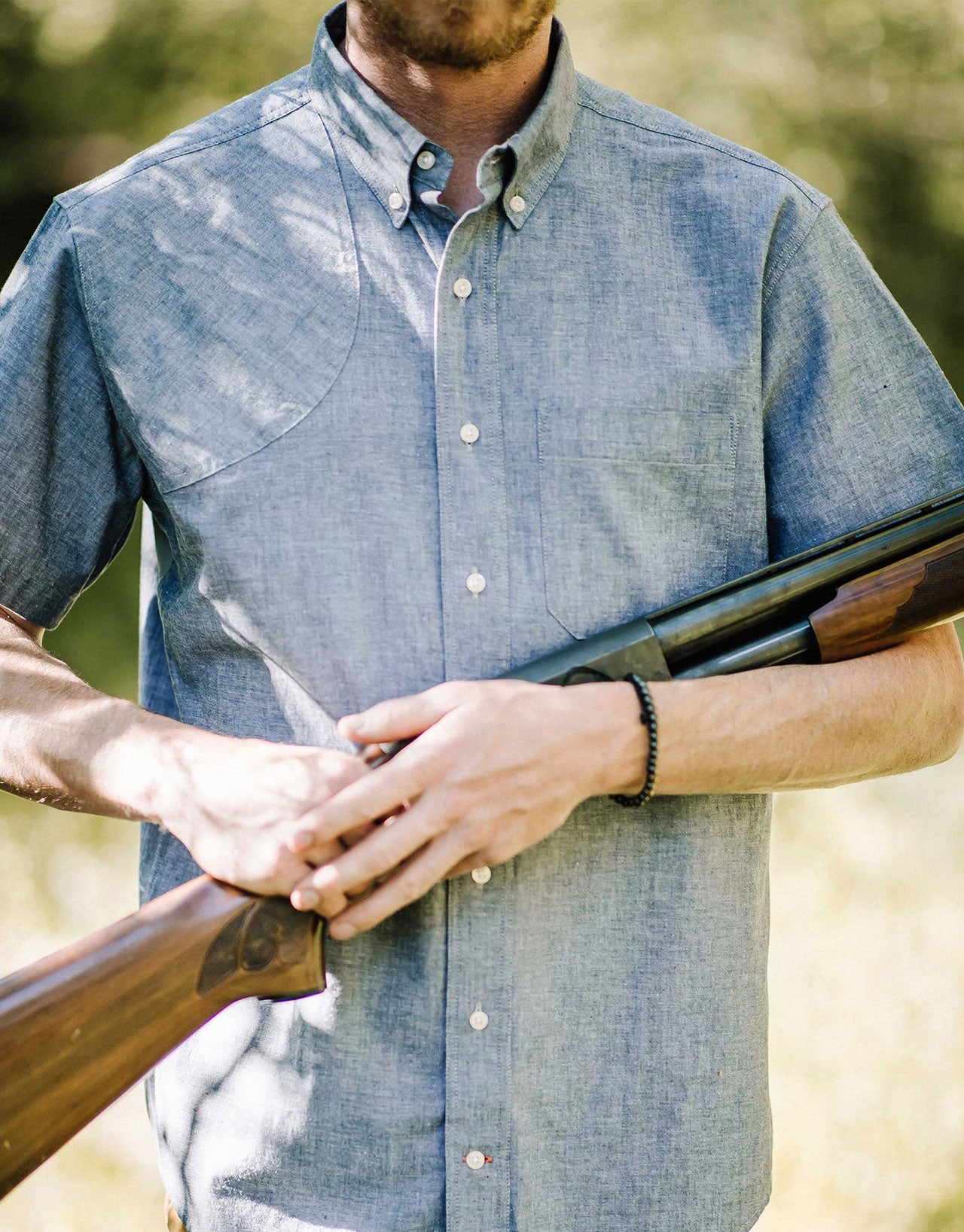 Our best selling Sportsman's shirt, now available in a short sleeve chambray for the perfect blend of breathability and durability. This button down collared shirt features double needle stitching throughout, subtle reinforcement on the shooting shoulder, and our Tech Vent® underarm ventilation to help keep you cool when swinging a shot gun or casting a rod.