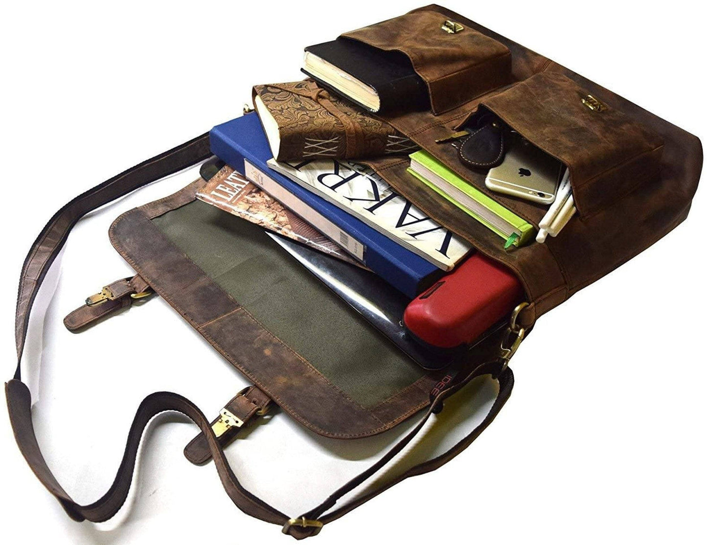 Crafted from pure buffalo leather and decorated with brass hardware for a professional and trendy yet sturdy vintage appearance. The Buffalo messenger bag can fit a 17-inch laptop and other useful stuff like iPads, books, and documents. includes a shoulder strap and handle for flexible usage as a laptop bag, handbag, briefcase, or messenger bag.