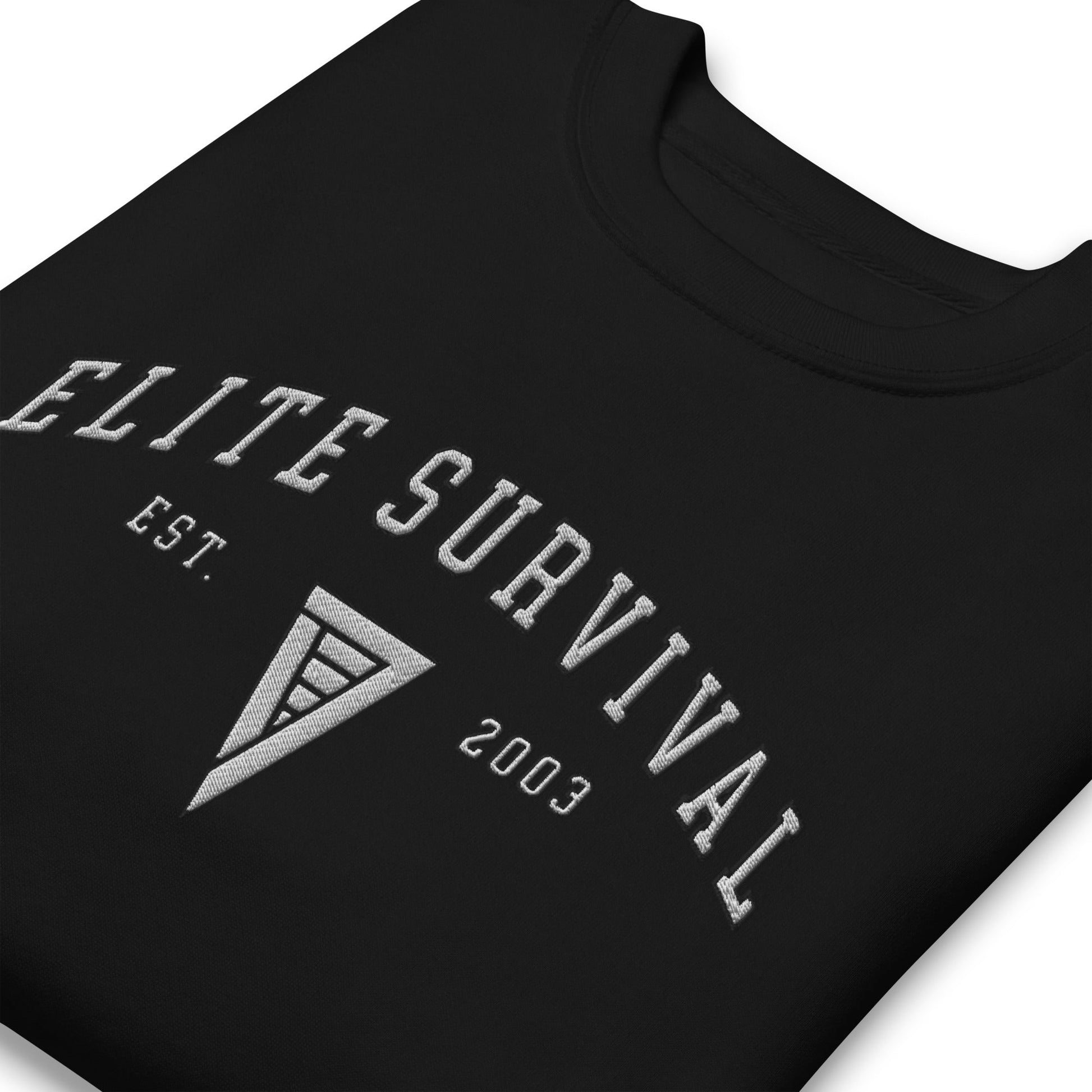 Classic sweatshirt silhouette with ribbed crew neck, long sleeve cuffs, and a flat hem. Elite Survival and Emblem embroidery. Layer it up or wear it on its own for a contemporary streetwear look.