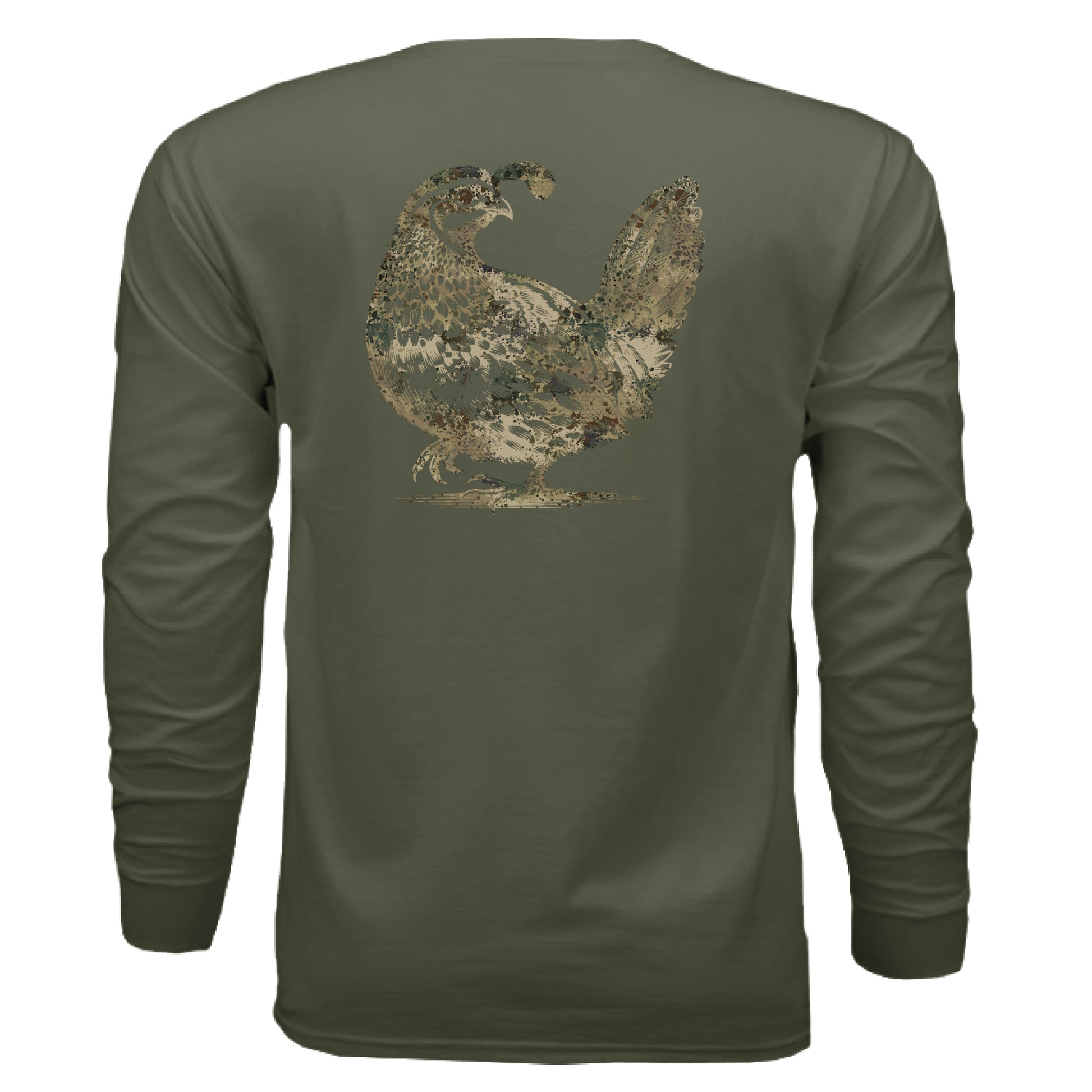 Chase coveys in style with the Upland Splash Burst Camo California Quail Long Sleeve T-Shirt. Featuring a field-inspired splash camo pattern and a detailed California quail graphic, this shirt captures the excitement of upland hunting across golden grasslands. Made from a soft, breathable cotton-poly blend, it delivers lightweight warmth and full coverage — perfect for early morning walks, scouting trips, or relaxing at camp after the hunt. Designed for hunters who live for the upland chase.