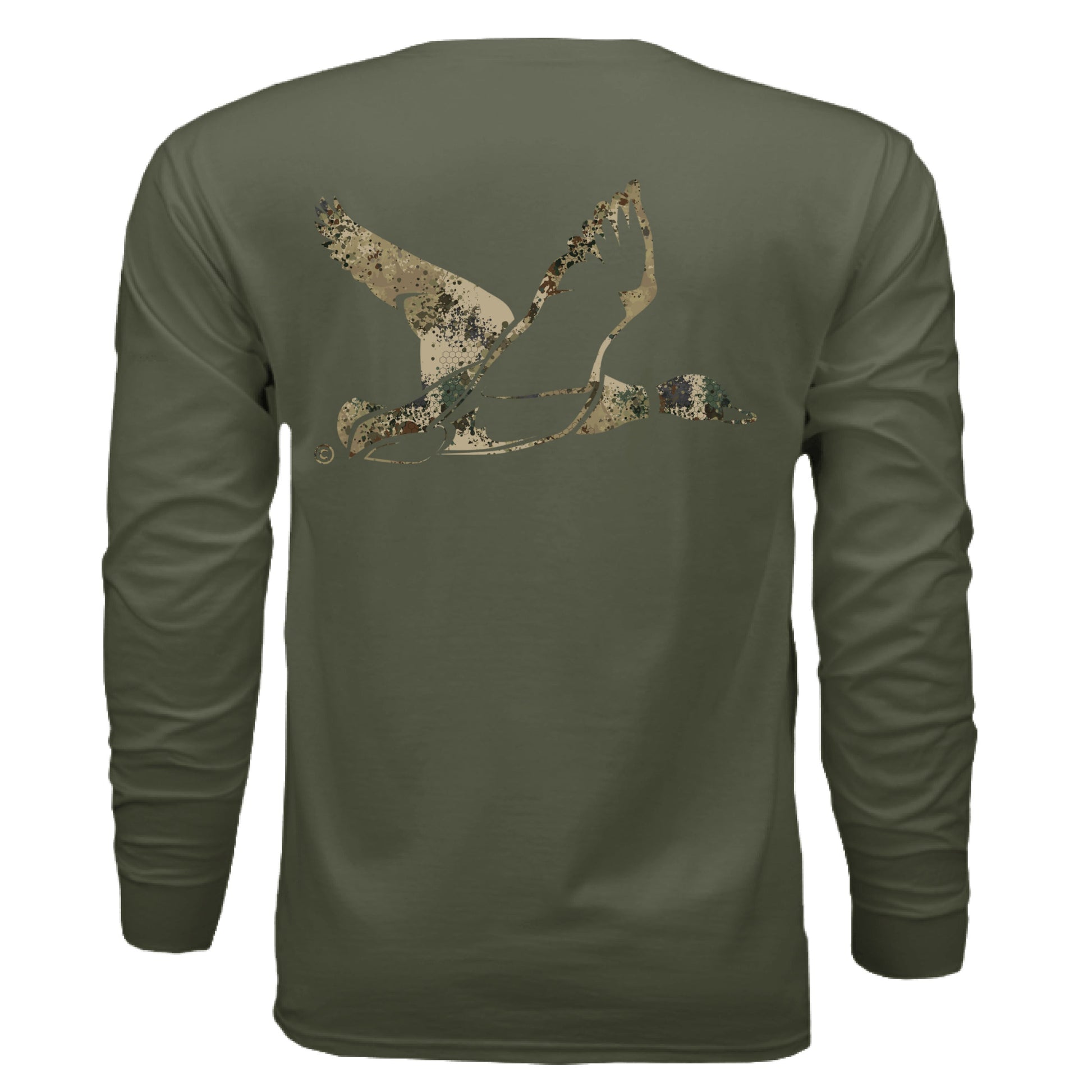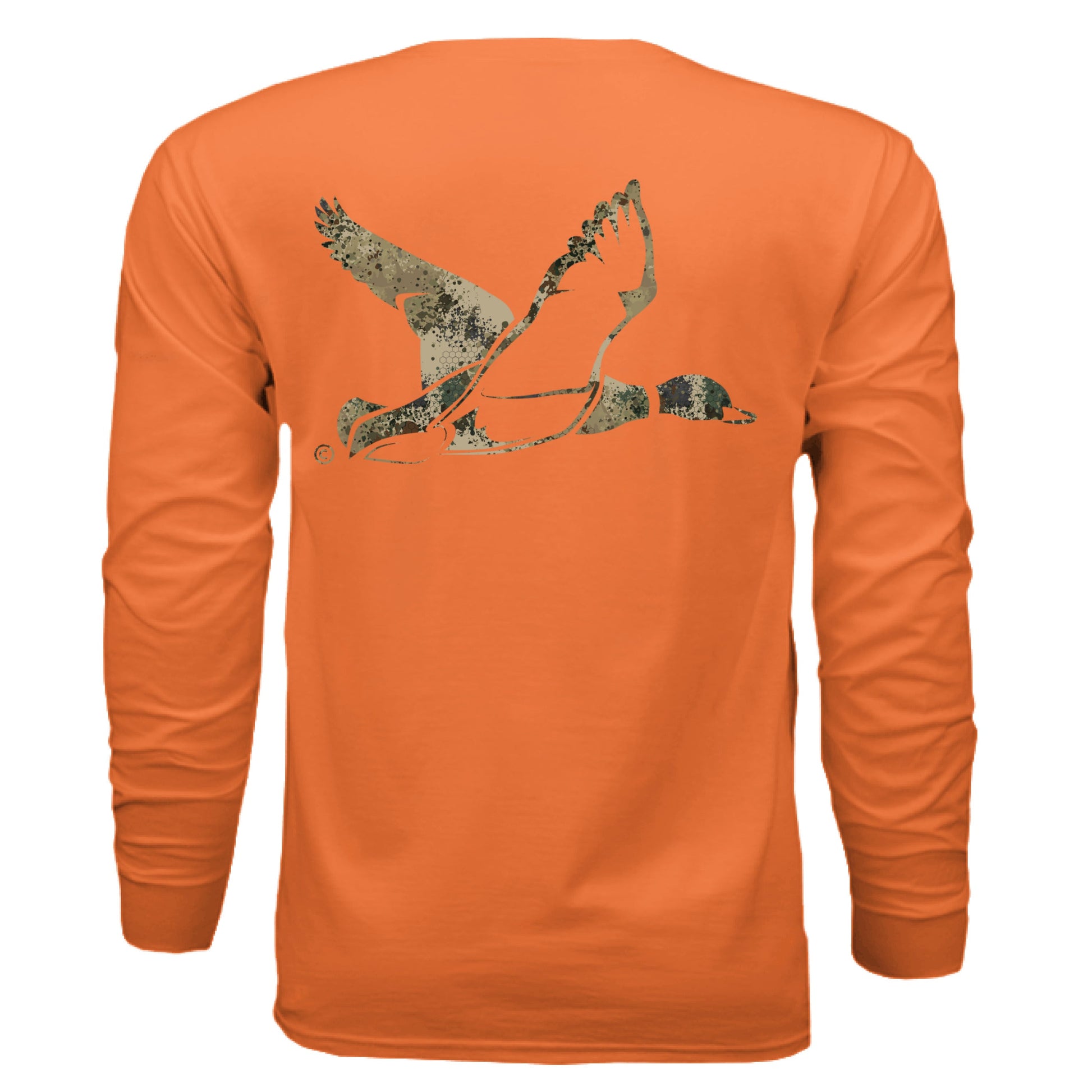 Take on waterfowl season in comfort and style with the Upland Splash Burst Camo Duck Long Sleeve T-Shirt. Featuring a rugged upland-inspired splash camo pattern and a striking duck graphic in flight, this shirt captures the excitement of the hunt. Crafted from a soft, breathable cotton-poly blend, it provides lightweight warmth and full coverage — ideal for chilly mornings in the blind, scouting trips, or relaxing after a successful day afield. Built for hunters who thrive in the marsh and fields alike.