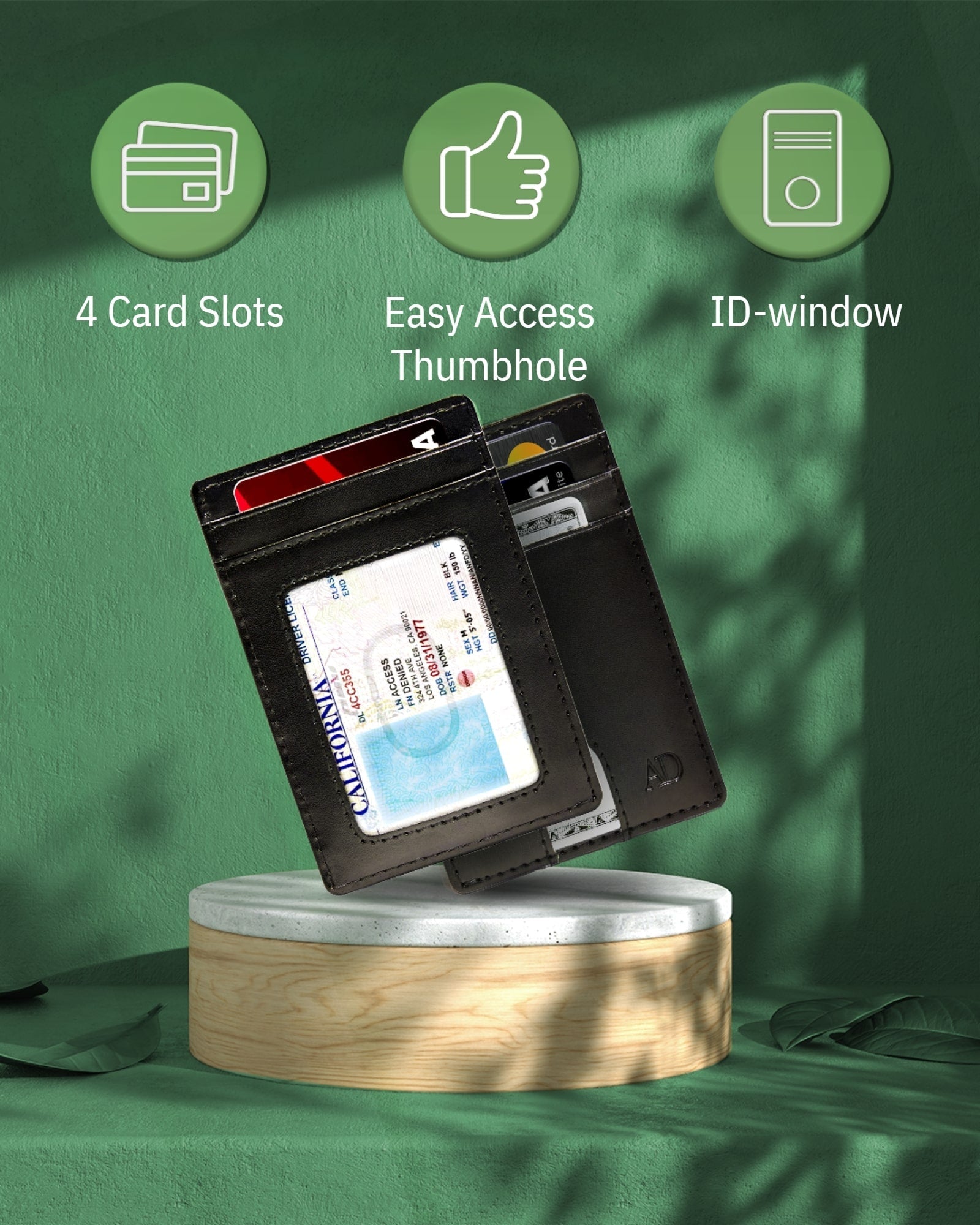 This Cardholder has 4 credit card slots, 1 ID Window, 1 pocket, and 1 cash compartment. The thumbhole is designed with a special finger hole design, giving easy access to your favorite card
